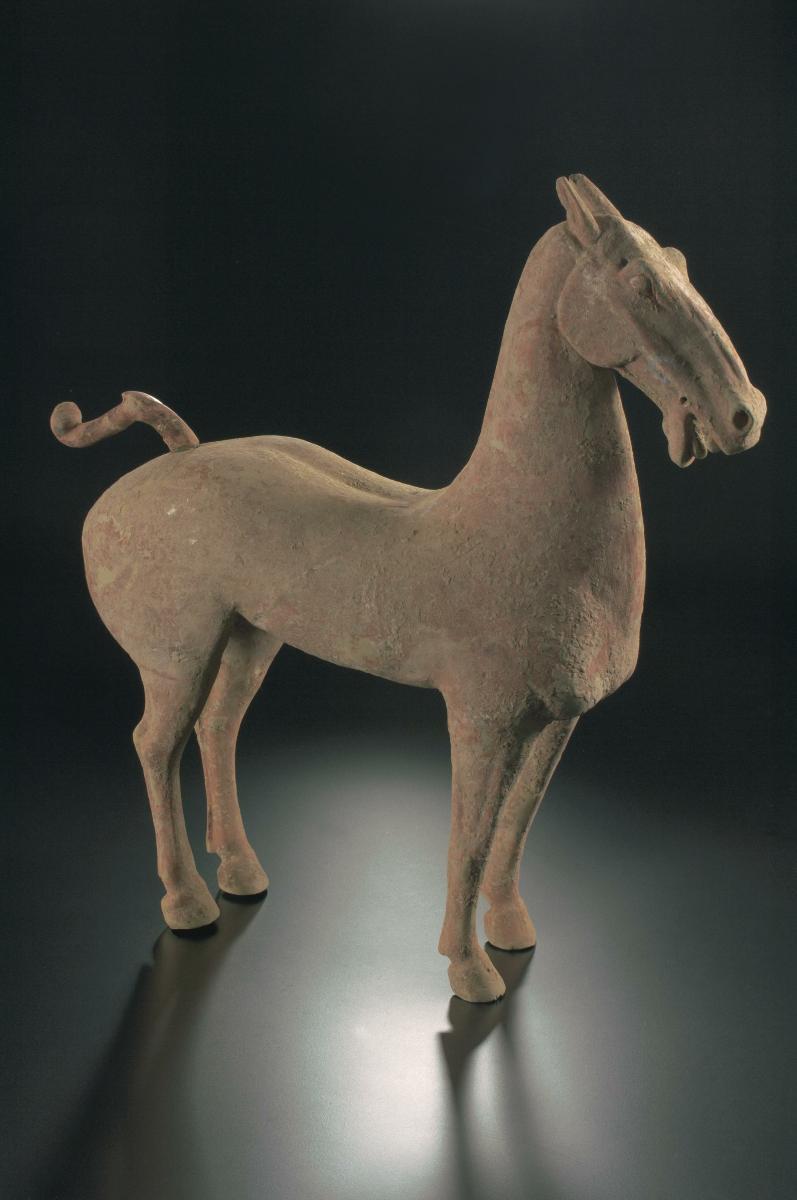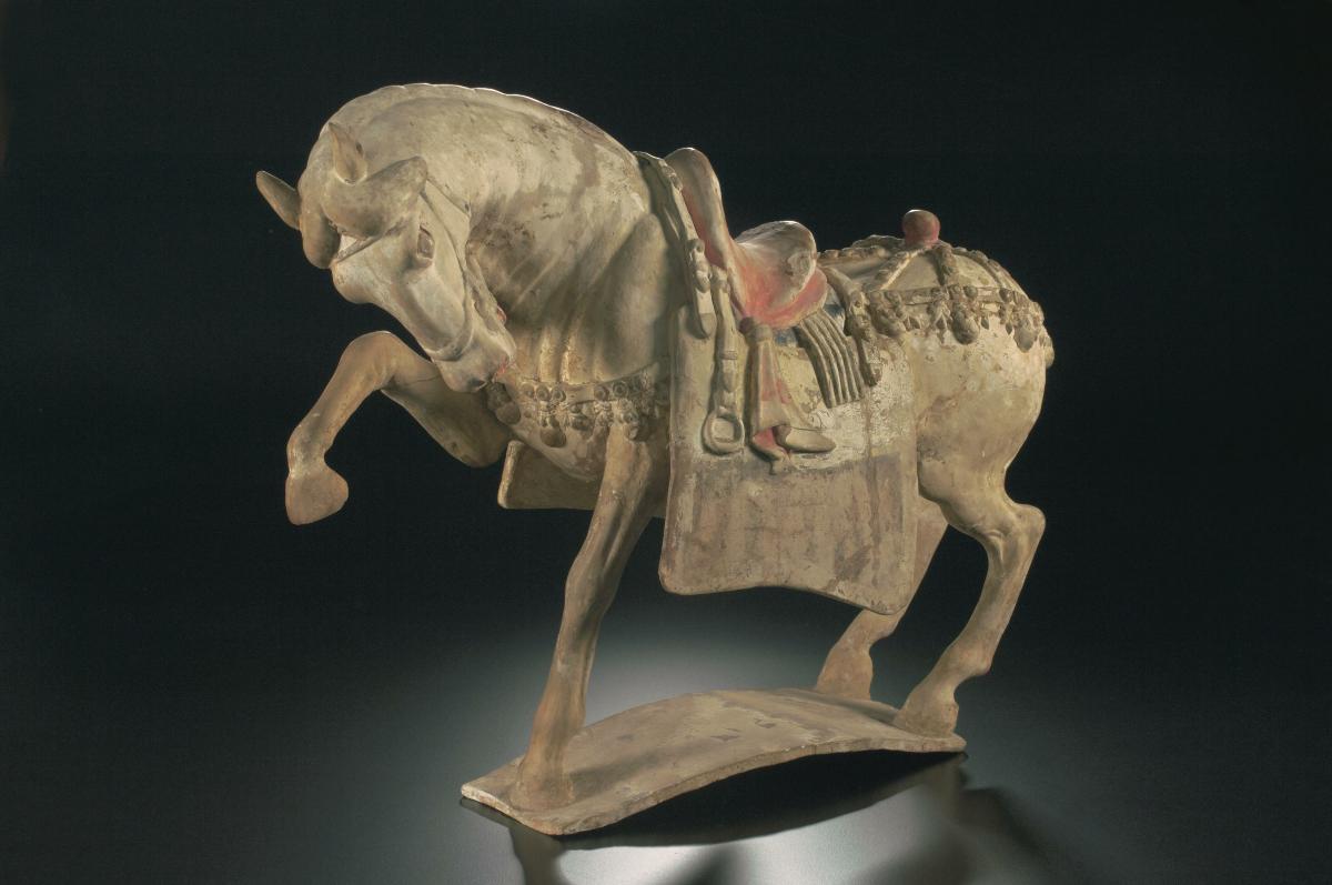 This lead-glazed or 'sancai' (‘three colour’) horse with pigment-painted saddle would have been part of a group of pottery tomb animals. It is painted a peach glaze with an orange saddle. The practice of using lead-glazed burial wares had already started during the Han dynasty (206 BCE-220 CE). This glaze technology further developed during the Tang dynasty (618-906) into ‘sancai’ (‘three-colour’) glaze. It included colours such as cream, amber, brown and blue. This tradition of decoration continued into the Ming period. The importance of horses to the Chinese ruling class can be seen in the large numbers of pottery sculptures that have been found in Chinese tombs. Apart from military uses, the horse also played a central role in the long-distance trade over the Silk Road. The custom of making 'mingqi' or burial wares was an ancient practice. Elaborate groups of burial wares were also a display of wealth and social status.