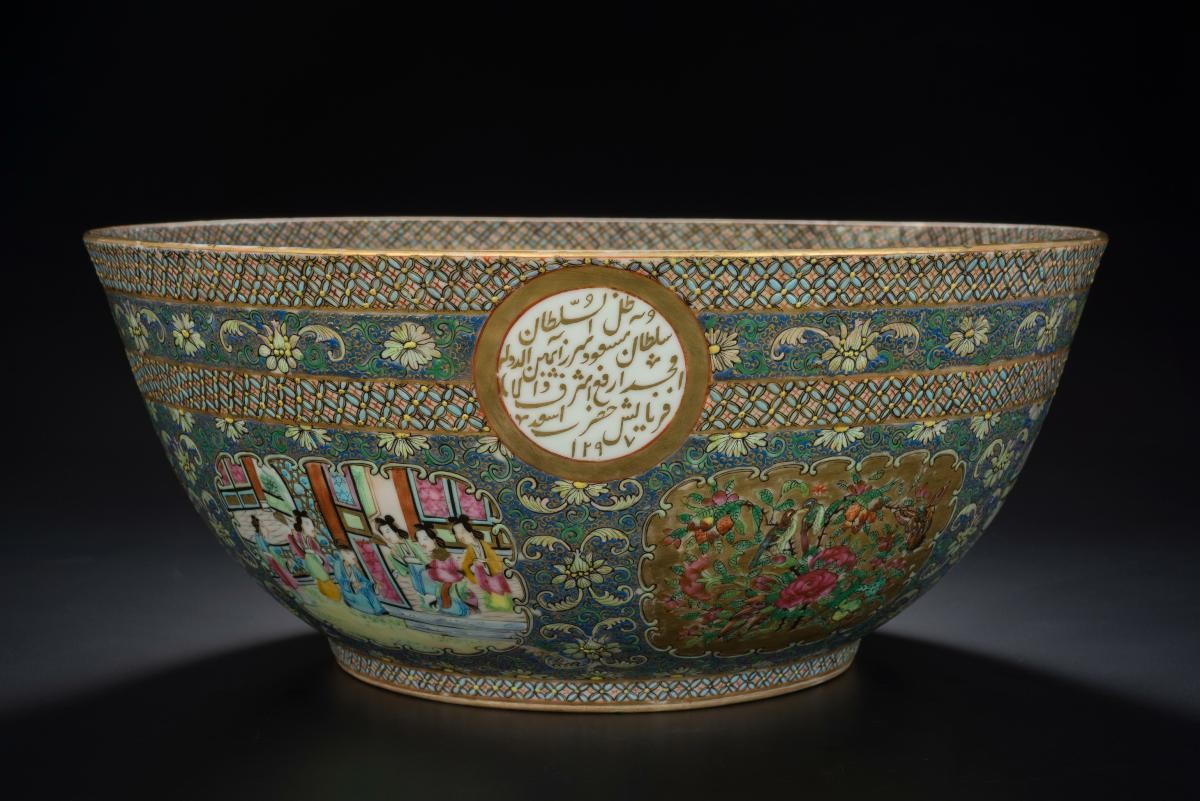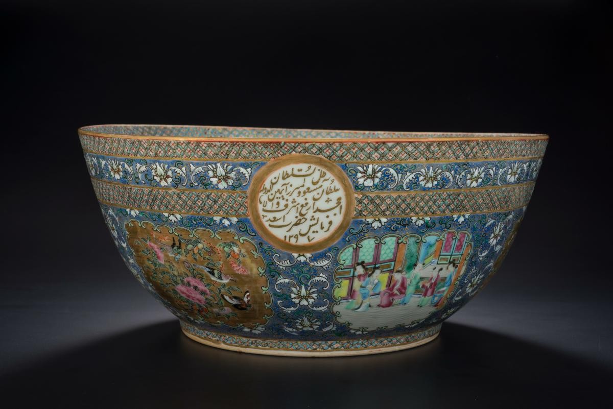 This bowl is painted with decorations comprising Persian verses and 'boteh' (paisley) motifs in enamels and gold. Each piece is signed Mirza Buzurg Shirazi and dated AH 1260, which corresponds to 1844-5 CE. The verses relate the martyrdom of the third Imam of the Shi'a, al-Husayn ibn 'Ali, at the battle of Karbala in 680 CE.Objects such as this highlight the popularity and international appeal of Chinese porcelain. They were export wares intended for the West Asian or Indian markets, and the porcelain may possibly have been embellished in Lucknow, India. They may have been commissioned by a Shi'a patron perhaps for presentation to an Imambara, the congregation hall for Shi'a ritual ceremonies especially during the Muharram. Porcelain decorated with verses written for a Shi'a purpose is very rare.