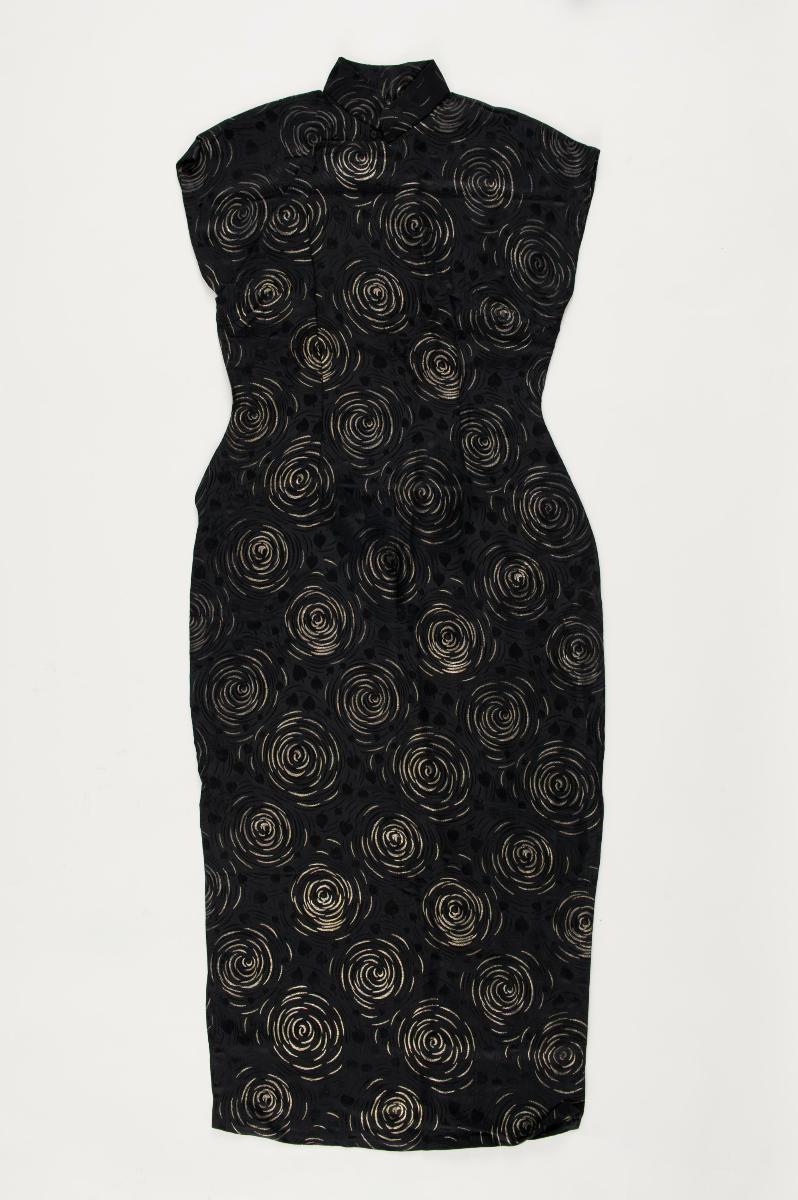 This is a sleeveless black brocade (silk textile with rich figuring worked with gold or silver supplementary weft threads) cheongsam with motif of phoenix and flowers allover. The collar, sleeves, flap on the right bodice and hems are lined with pink piping to serve as contrast. This cheongsam was worn by the donor Chong Sun Wah, who was an air stewardess at Sabena Airways (Belgium Airline) from 1974 - 1979. She was required to be dressed in her traditional costume.