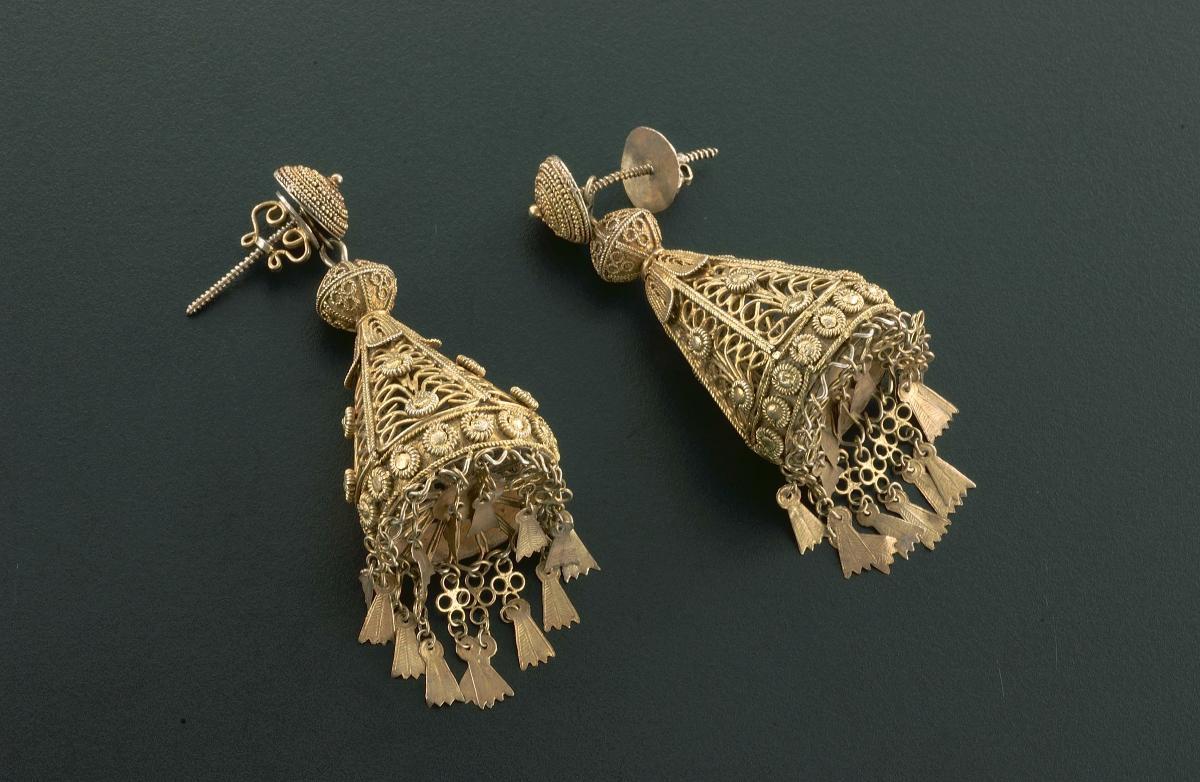This pair of scroll-shaped earrings represents a fraction of the wide repertoire of silver jewellery made, worn and exchanged by highland communities in northern Thailand. This type is worn particularly by the Lahu women.The Lahu is an ethnic minority group who migrated into Northern Thailand from China and Burma during the 18th and 19th centuries. For many highland communities, silver was valued more highly than gold. Silver jewellery was a way of investing a family’s wealth to be passed down as heirlooms. It was also believed to have protective properties. Today, where security maybe a problem, silver is kept locked away while aluminium is used as a substitute.