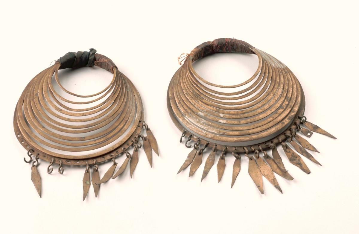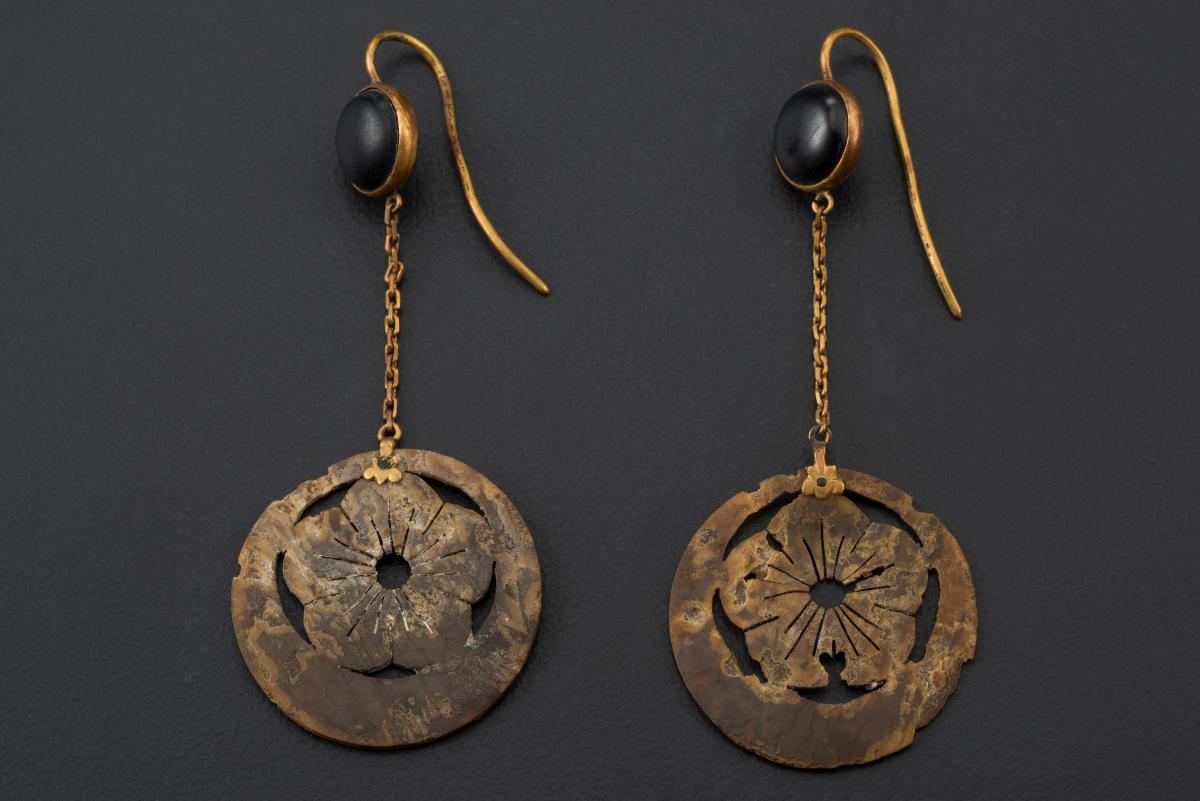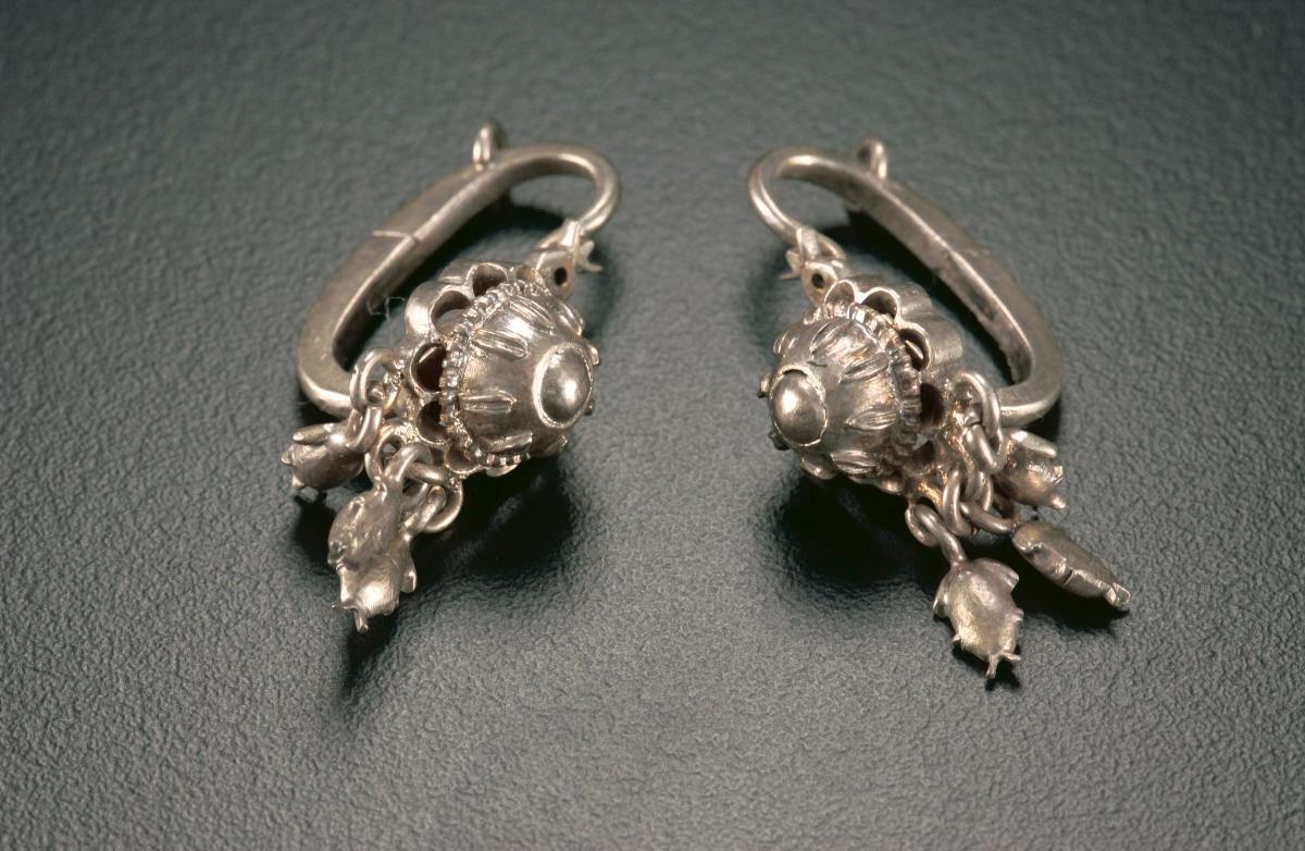 These Kushana period (1st-4th centuries CE) earrings are made with sheet gold, embossed and granulated, with the two sides soldered together at the inner and outer edges. Hinges are conspicuously absent, which probably means the wearer must have wide openings in the earlobes to slide them through. It is unusual to find pre-Kushana or Kushana earrings survive as a pair. The use of gold and silver, along with pearls and beads during this period, suggests the importance of jewellery in the fashion of the day. They were not just decorative but had a social, religious and economic significance.