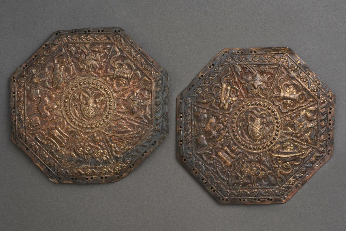 These two octagonal shaped pieces of beadwork are bolster ends, used by Peranakan Chinese to decorate the wedding bed. These pieces feature colourful floral designs on red velvet. It is believed that the ancestors of the Peranakan Chinese had adopted the use of pillow and bolster ends on the wedding bed from the local population. These were part of the wedding bed ornaments that were sewn by the bride to be inspected by the ladies of her prospective husband’s family. Other than pillow and bolster ends, slippers worn by Peranakan women are also beaded.