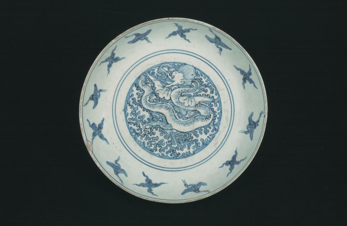 The undecorated light blue dish with an uneven shape has an unglazed ring in the center. This ring indicates that this dish had another dish stacked above it during firing. This dish was acquired in the Philippines and was used as a utility ware.Such export wares were produced in the kilns of Fujian province in South China. After the ban on overseas trade was lifted in 1567 during the Ming dynasty, export wares were produced in large quantities in Southern Chinese kiln mainly for the Southeast Asia market. They were of high demand especially in Indonesia and the Philippines.