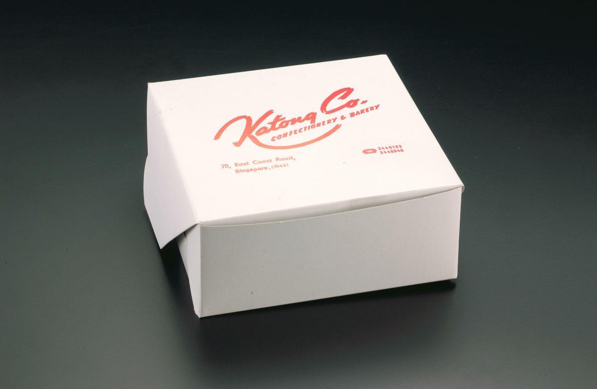 This is a cardboard cake box used by the Katong Co. Bakery and Confectionery, better known as the Red House Bakery due to the red exterior of its shophouse at East Coast Road. A Jewish man, Jim Baker, first set up the bakery shop in 1925. Later, a Hainanese seaman, Tan Siang Fuan (the donor’s father), paid a token amount of S$600 and took over the business in 1931. The bakery is located in a shophouse that is a wakaf property, which was put in trust to the Islamic Religious Council of Singapore by Sherrifa Zain Alsharoff Mohamed Alsogoff. Business ended in 2003 when the shophouse was found to be structurally unsafe.The Red House Bakery was popular for cakes and pastries such as curry puffs, Swiss rolls and barbecued pork buns. It was also a gathering place for local bands during the 1960s, as well as dating couples and matchmaking sessions. The bakery practised a payment system based on trust, the norm among old establishments. Customers would first choose and eat the items that they fancied, and then proceed to make payment.