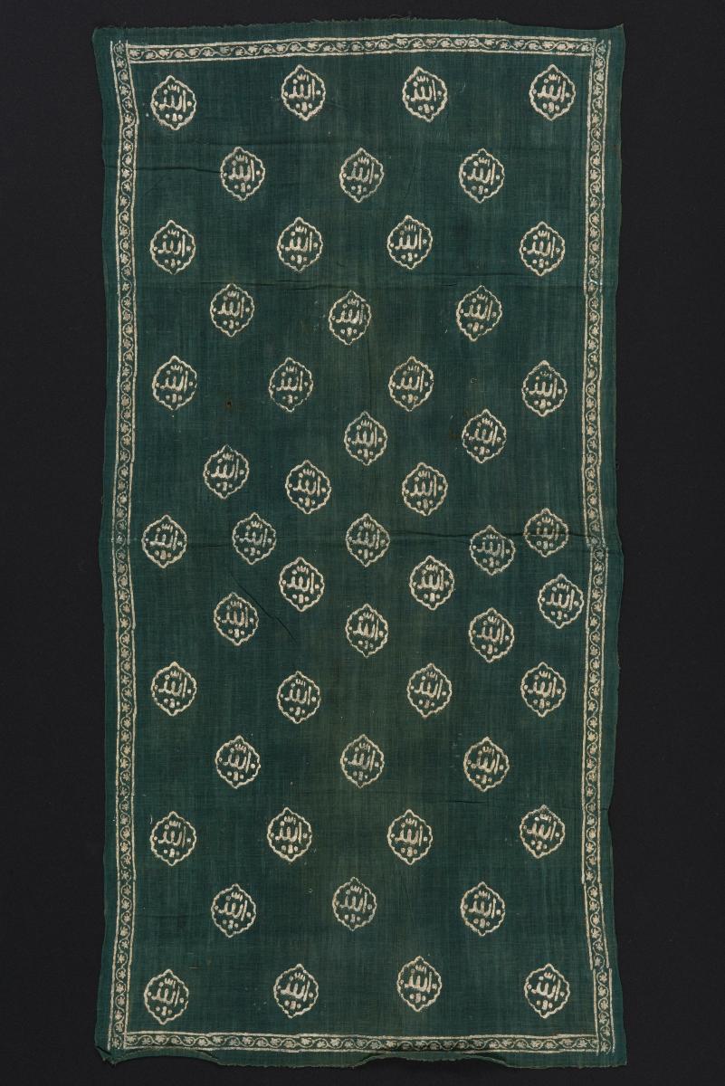 This Qalamkar cotton standard or flag (parcham in Persian) is decorated with the motif of a lion standing in front of a radiant human-faced sun. The motif of a lion with the sun is an ancient and popular symbol of power and royalty in Iran. This particular motif was officially adopted as a Qajar emblem during the reign of Muhammad Shah (reign, 1834-48). The body of the lion contains an Arabic prayer to ‘Ali known as 'nadi aliyyan'. The borders of this flag feature cartouches containing Persian verses that refer to Imam Husayn and his martydom in Karbala (Iraq). This strongly suggests that this flag was made to be carried during the Ashurah processions. Qalamkar refers to a technique where textiles are 'painted' with a pen then stencilled and dyed with chemicals.