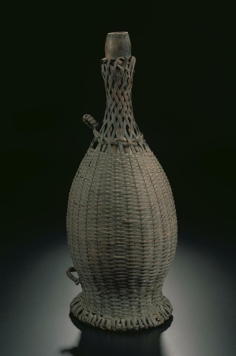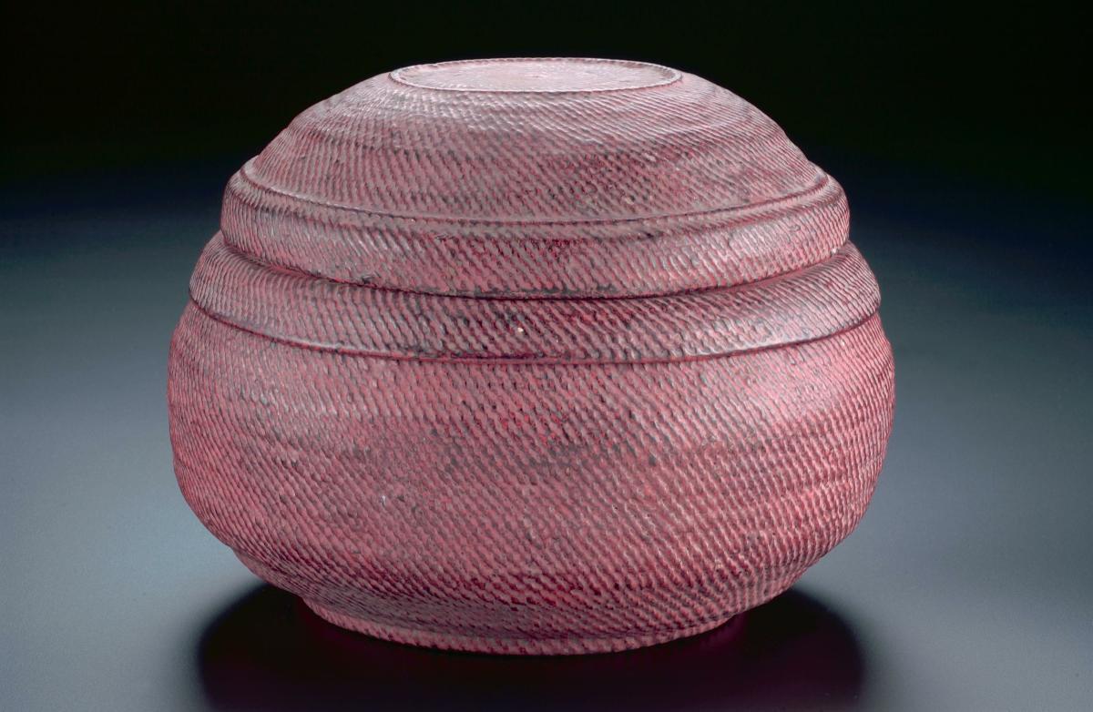 This basket was built on a round coiled base that graduates in size from bottom (smallest in diameter) to the shoulder (largest in diameter) of the container. Rattan forms the basic structure and rattan splits are used to hold the coiling together. Used by the Ifugao people for storing rice grains.