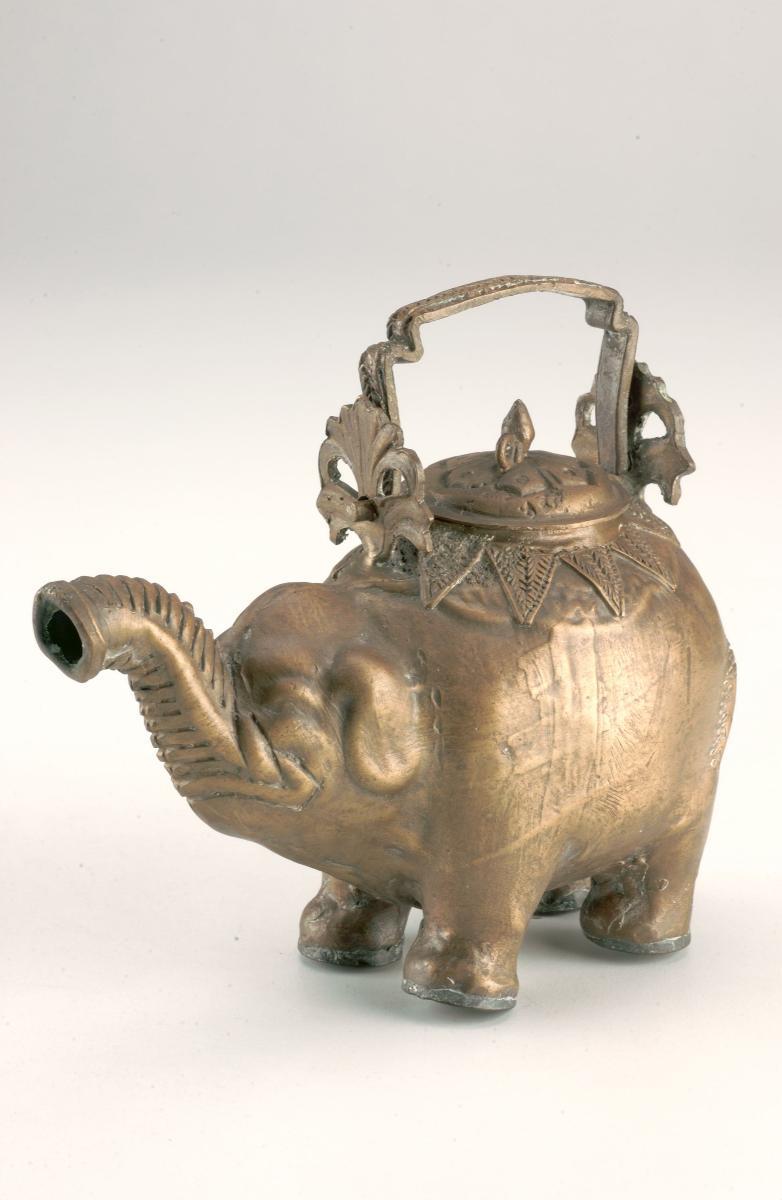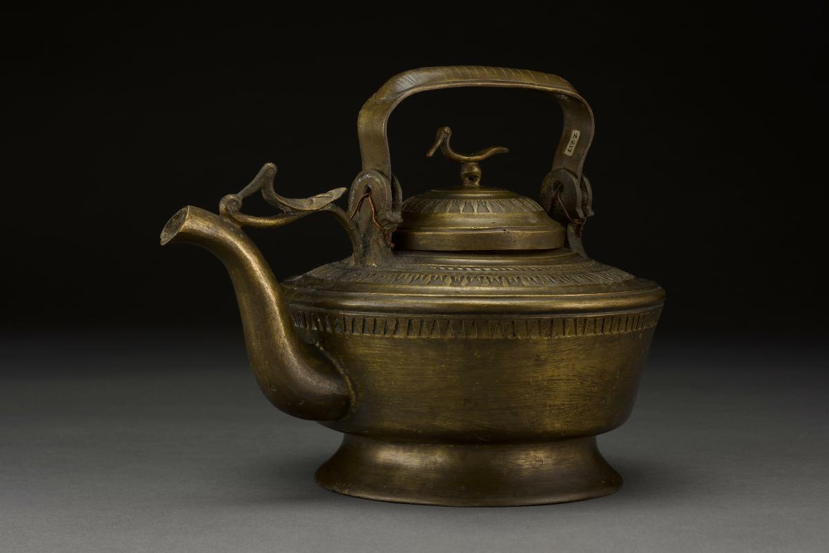 This kettle is decorated with chased floral motif. Water is poured into the kettle through the aperture located at the top of the handle.Kettles such as this were used to serve drinking water during weddings or festivals. It may have also been used to store water for washing the right hand after eating.