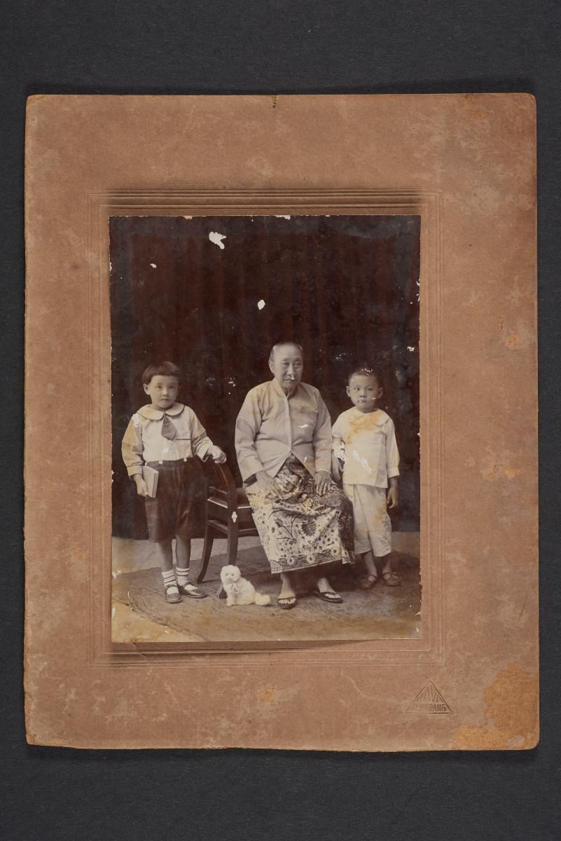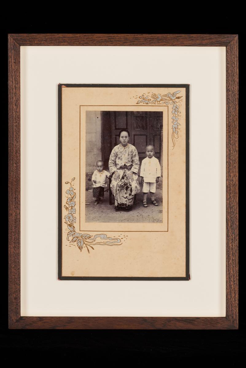 This is a photograph of two young Nyonyas and two young boys. The young Nyonyas wear a more modern form of the baju, having moved away from the baju panjang or long tunic, showing the changing of the fashion of the times. The baju panjang was the standard Peranakan women wear for much of the 19th century, which was long and loose fitting, making it suitable in the hot, humid climate of the region. Also, it projects a modest appearance. Nevertheless, this change of the clothing style to a more modern one retains much of the style of the old baju panjang.