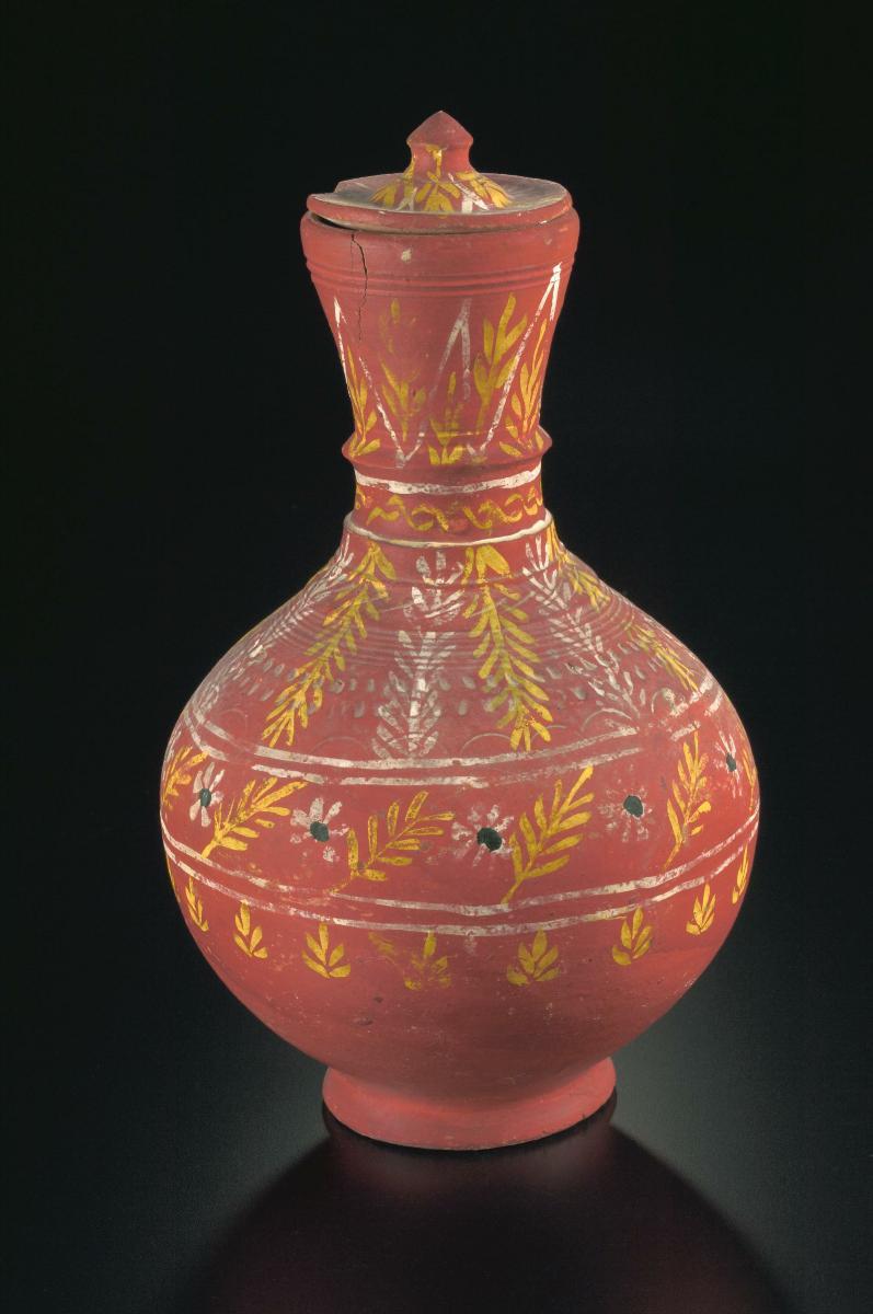 This water jar has a long, narrow neck and is decorated with floral motif within longitudinal bands. The jar’s shoulder features the triangular ‘pucuk rebung’ (bamboo shoot) motif.