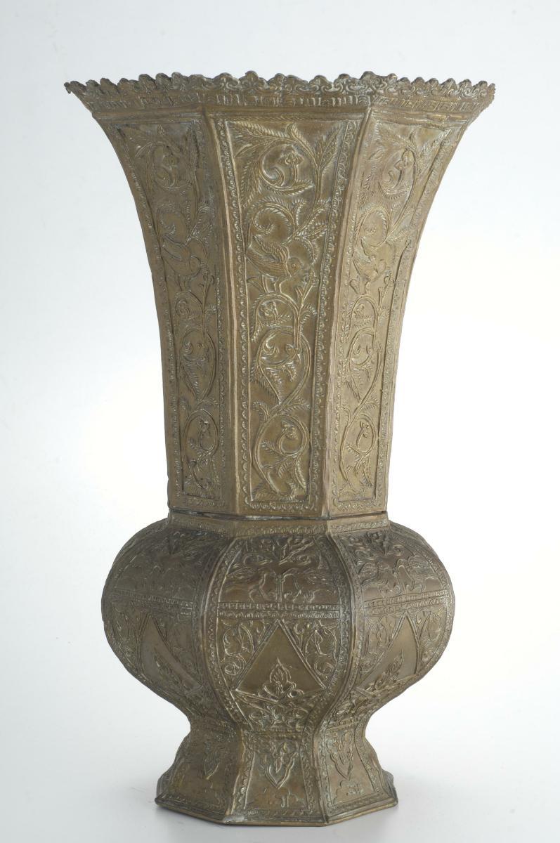 This spittoon has a flared mouth with scalloped edge, a bulbous body and a handle. It is undecorated which suggests that the emphasis was more on the functional shape of the object rather that then on the decorative pattern.Spittoons, such as this one, were essential paraphernalia of Malay households because of the habit of chewing betel, the nut of the areca palm tree. Chewing it with lime and other ingredients stimulate the production of red spittle that needed to be disposed of.