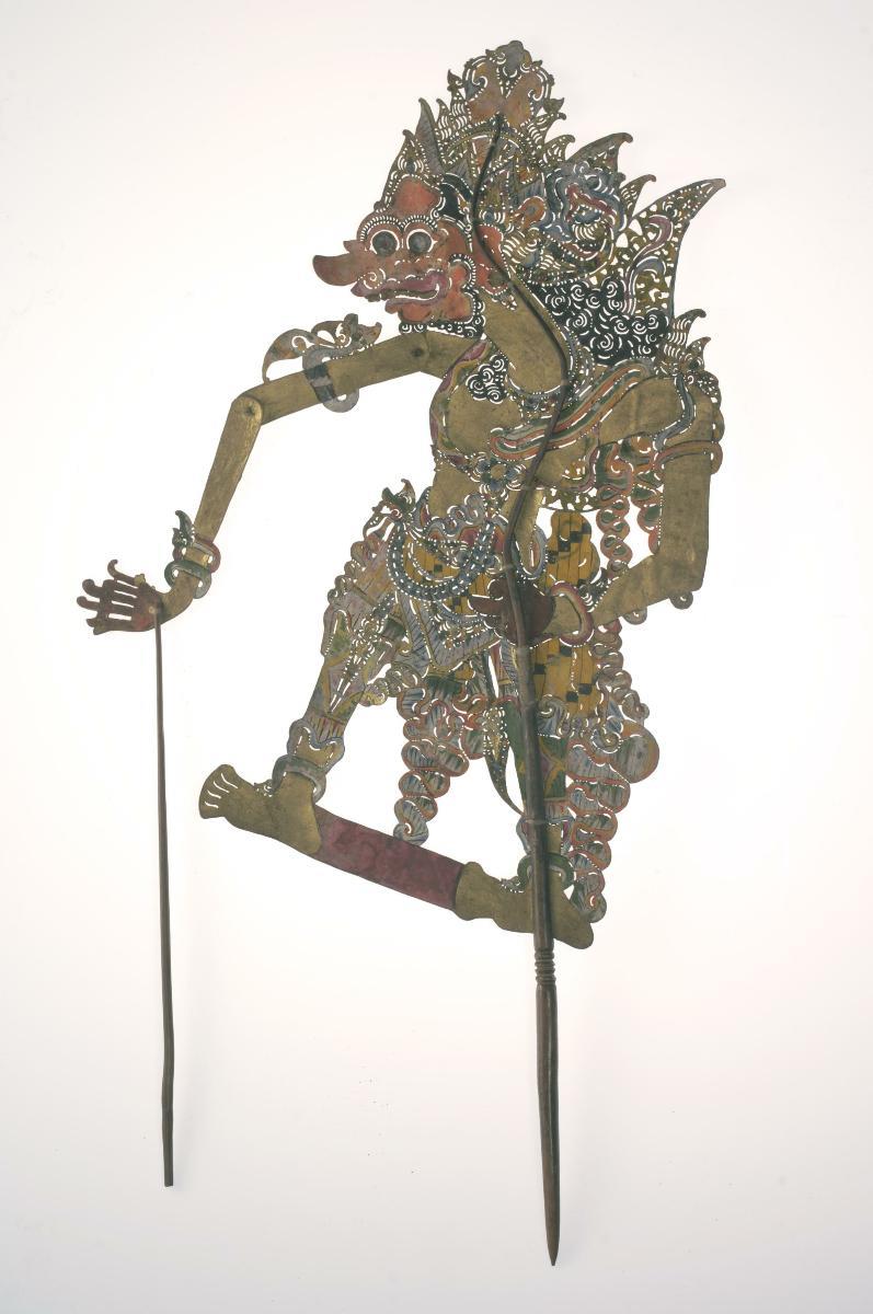This puppet represents the character of an ogre king in the Javanese 'wayang kulit' or leather shadow puppet theatre tradition. The status of the character is indicated by the ‘makuta’ (crown) and 'praba' (winged ornament) on his back. His wide-open eyes, bulbous nose, a grinning mouth revealing his incisors, reflect a typical coarse or violent character.The vast majority of the ‘wayang’ plays performed are drawn from the two great Hindu epics, the Ramayana and the Mahabharata with as well as stories of Javanese origin. 'Wayang kulit' is considered as the highest of the Javanese performing arts. Performed in the royal courts of Java as early as the ninth century, this tradition continues to be treasured as one of the ‘pusaka’ or sacred heirlooms of the court. 'Wayang kulit' is traditionally performed on ritual days and religious ceremonies. It has also been adapted more recently for television and public education campaigns.