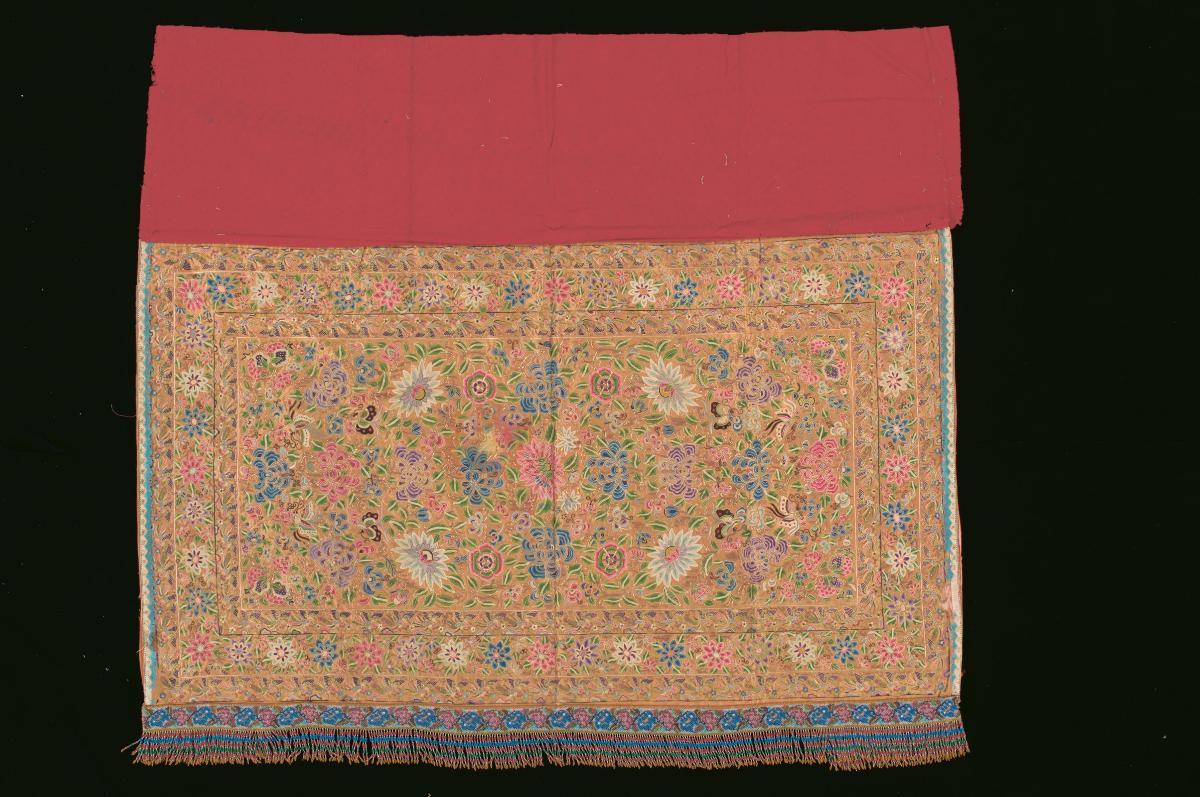 This embroidered panel used as a table cloth is created using Peking knots and metallic thread couching. Beaded tassels run along the edges of the panel. It is an example of beadwork which is an important aspect of Peranakan material culture. It contains floral and bird motifs. ‘Manek kacha’ is a term generally used to refer to the tiny and brightly coloured glass beads that were likely to have been imported from Europe. Steel beads were also used by Peranakan Chinese in the Straits Settlements. Stitching, a technique where beads were fastened onto a fabric base with needle and thread, is probably the most commonly seen method of beadwork.