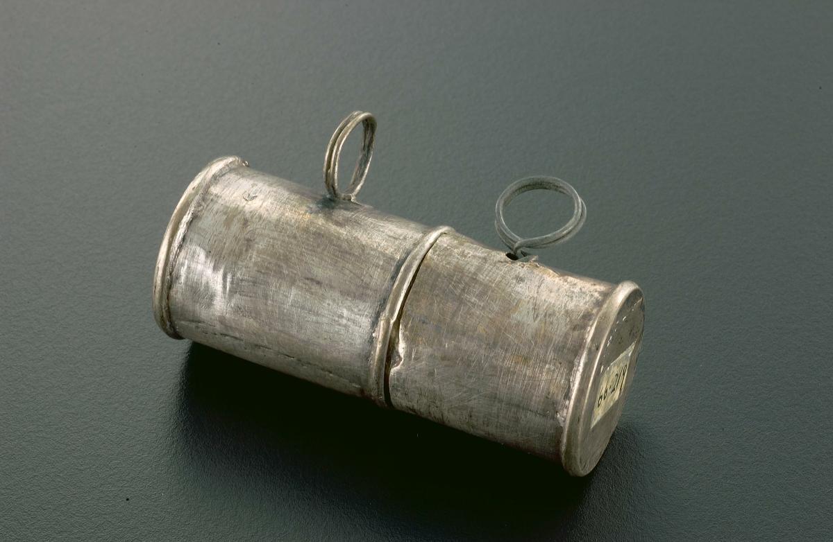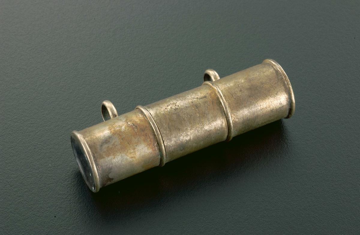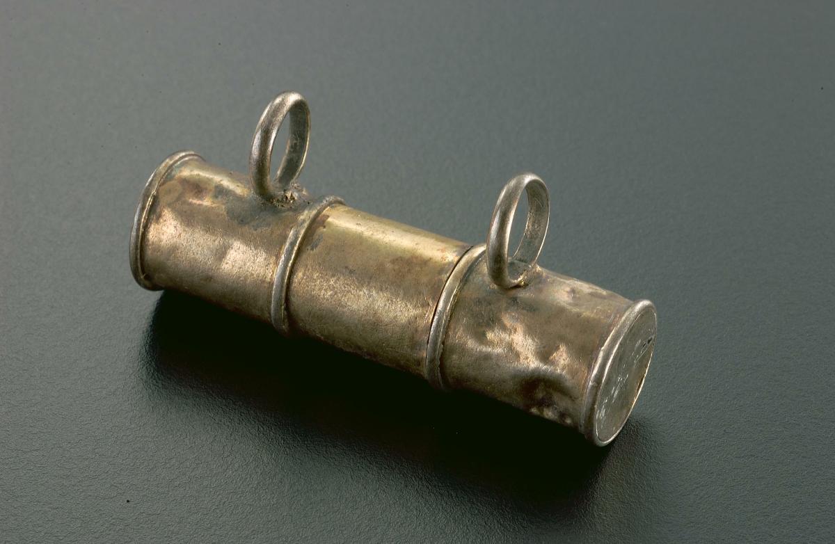 This amulet is made of gilt silver and tiger's claw. It is known as kuku harimo tangkal. Kuku is the Malay word for 'claw', harimo is the Baba Malay word for 'tiger' and tangkal is the Malay word for 'amulet'. In the early 20th century, mortality rates were high and the Peranakans believed that amulets could ward off the 'unclean' things that caused the illnesses. Some believed that amulets should be worn when one had to leave the house as the wearer was no longer under the protection of the house's guardian deities.