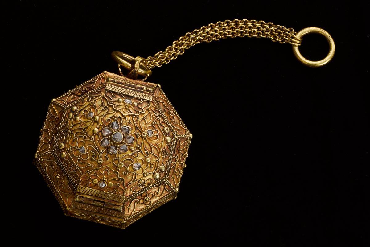 This octagonal-shaped tobacco box is decoratd with incised floral motif. The black colour suggests that it had also been filled with niello, a black mixture of copper, silver, and lead sulphides, used as an inlay on engraved or etched metal. It was hung from or tucked in the belt of the wearer. It could also be attached to silk cloths that were worn over the shoulder with the pendant article hung in front. It served as portable sireh set as it was made to hold tobacco along with sliced areca nuts or betel quid when the user was travelling outside the home.Shreds of tobacco were rolled into little ball and slipped under the upper lip to provide change of flavour in the mouth and to clean the teeth. Though it does not form part of the betel quid, fine shredded tobacco leaves were added occasionally. Tobacco boxes were cast, both for domestic and travelling purposes, and it inadvertently became part of betel chewing paraphernalia.