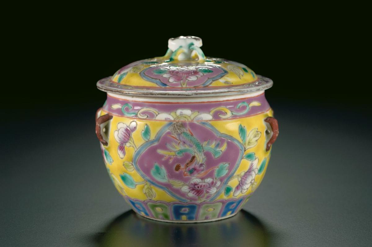 The origin of the word 'kamcheng' is uncertain. It has been interpreted variously as a Hokkien term for 'covered jar' or more literally, 'covered teacup'. In Mandarin, the term translates into 'gai zhong' (盖重, 'covered soup measure'). The kamcheng has various functions and was made in a wide variety of sizes and colours. In general, it was used for storing drinking water, soups, desserts, and pickles for special occasions. The miniature versions were used as cosmetic containers while the largest ones were reportedly used as decorative status symbols for wealthy families.