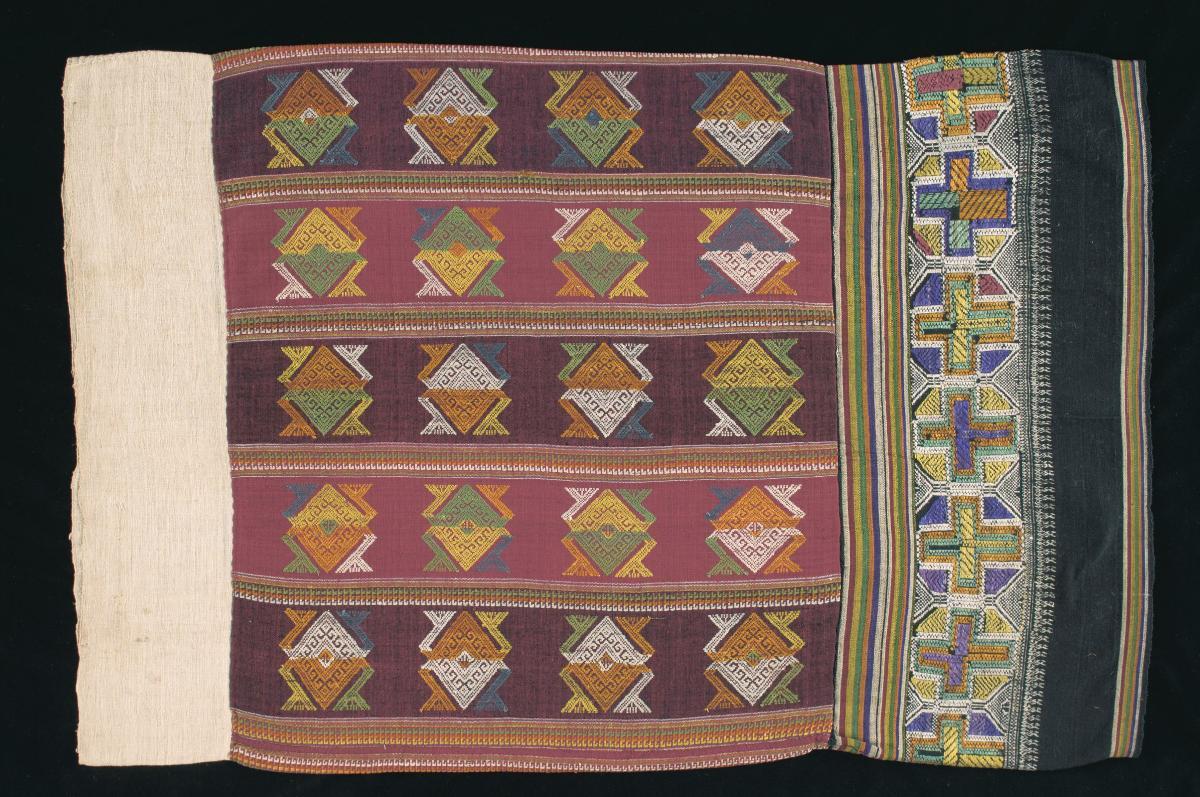This textile is known as a 'Phaa Sin'. It is a ceremonial tubeskirt that was made and worn by women of the Tai Neua ethnic groups living in northern Laos. The textile was handwoven using hand-reeled silk and handspun cotton together with natural dyes. The geometric patterns were created with the supplementary weft weaving technique. The elaborate work on this piece of textile suggests that it was made for a special occasion such as a wedding.