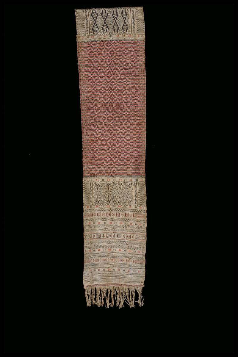 This long textile is known as 'phaa phan hua' or head cloth. The cotton cloth made of indigo-dyed plain weave is embroidered with cross-stitch using silk yarns. This type of head cloth was worn by Yao (Mien) women.The Mien or Yao as they are often called, probably lived in southern China about 2,000 years ago. They used to write in Chinese and speak a language derived from the Sino-Tibetan family of languages. The Yao migrated during the mid 19th century from Laos to Thailand.