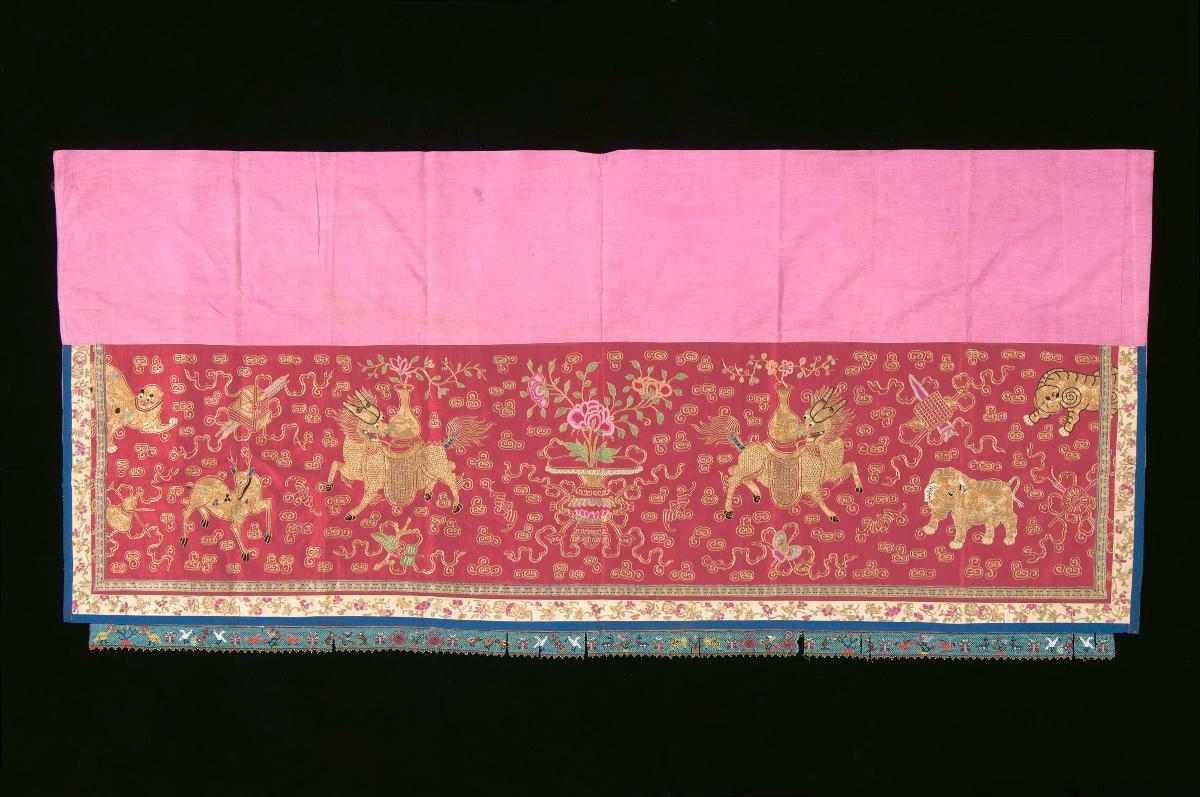 This bed hanging is elaborately embroidered in red, green, lavender and yellow silk with gold and coloured threads. The top panel has motifs of birds, pheasant. phoenix, deer, lantern, fingered citron, potted flowers and joss-stick burner. The motifs are repeated in the bottom panel and also includes two lions playing with balls.Bed hangings such these along with other auspicious symbols and decorations were part of the ensemble that adorned the traditional Peranakan wedding bed.