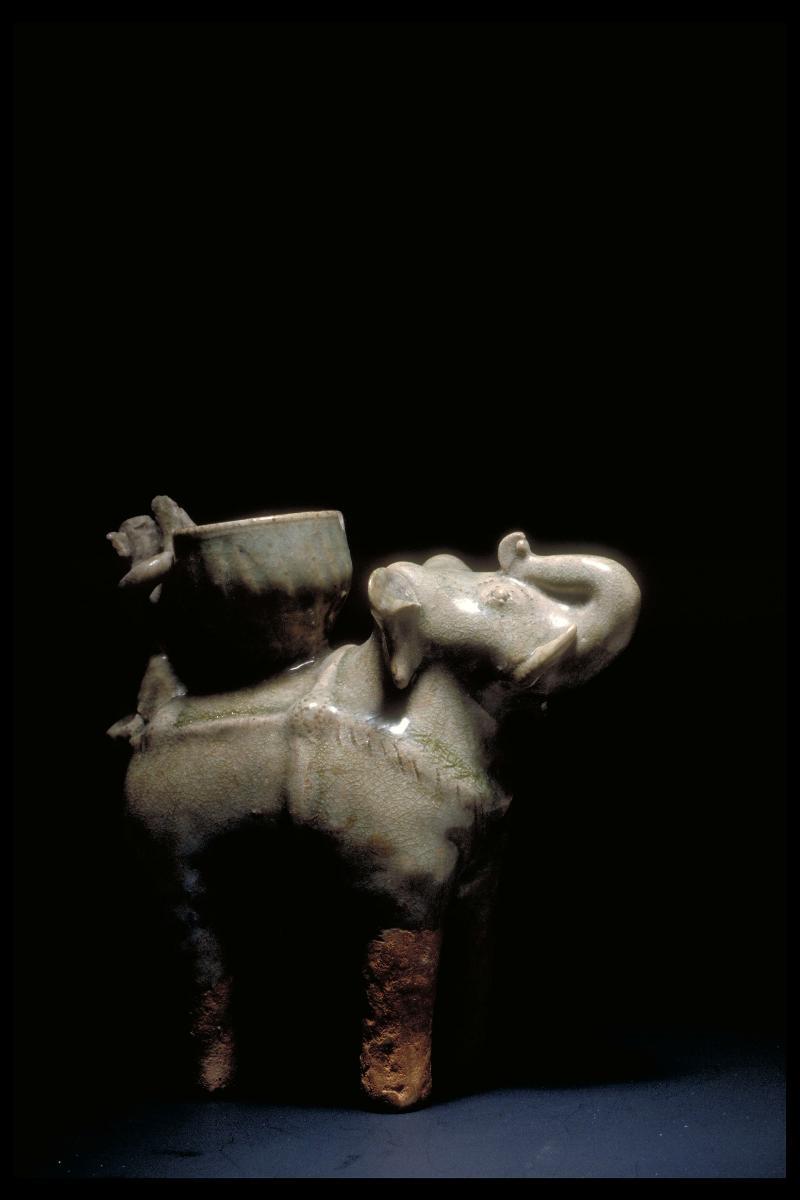This figurine of a kneeling elephant with underglaze iron-brown decoration was made in Si Satchanalai, one of the twin royal cities in the Sukhothai period from the mid 13th to the mid 15th century. Kilns in this region were some of the largest ceramic producers in Southeast Asia at this time.