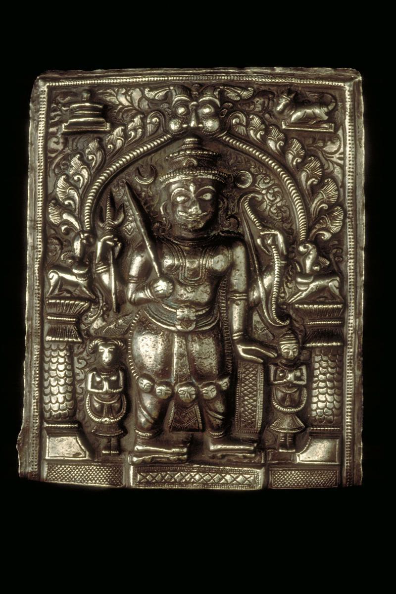 This gold plaque illustrates the coronation of Rama (the hero of the Indian epic, Ramayana). This piece is embossed and cut out of sheet gold with exquisite details worked on the surface. At the center of the plaque, under the canopy sits the enthroned Rama and his wife, Sita and their attendants. Hanuman, the monkey god is touching Rama's feet while Vibhishana (younger brother of the demon Ravana) offers Rama a garland. This image also represents an age of peace and happiness which according to the Hindu tradition is the utopian state of Ramarajya. Such gold plaques are rare but the representation of Rama’s court scenes are much favoured all over India.
