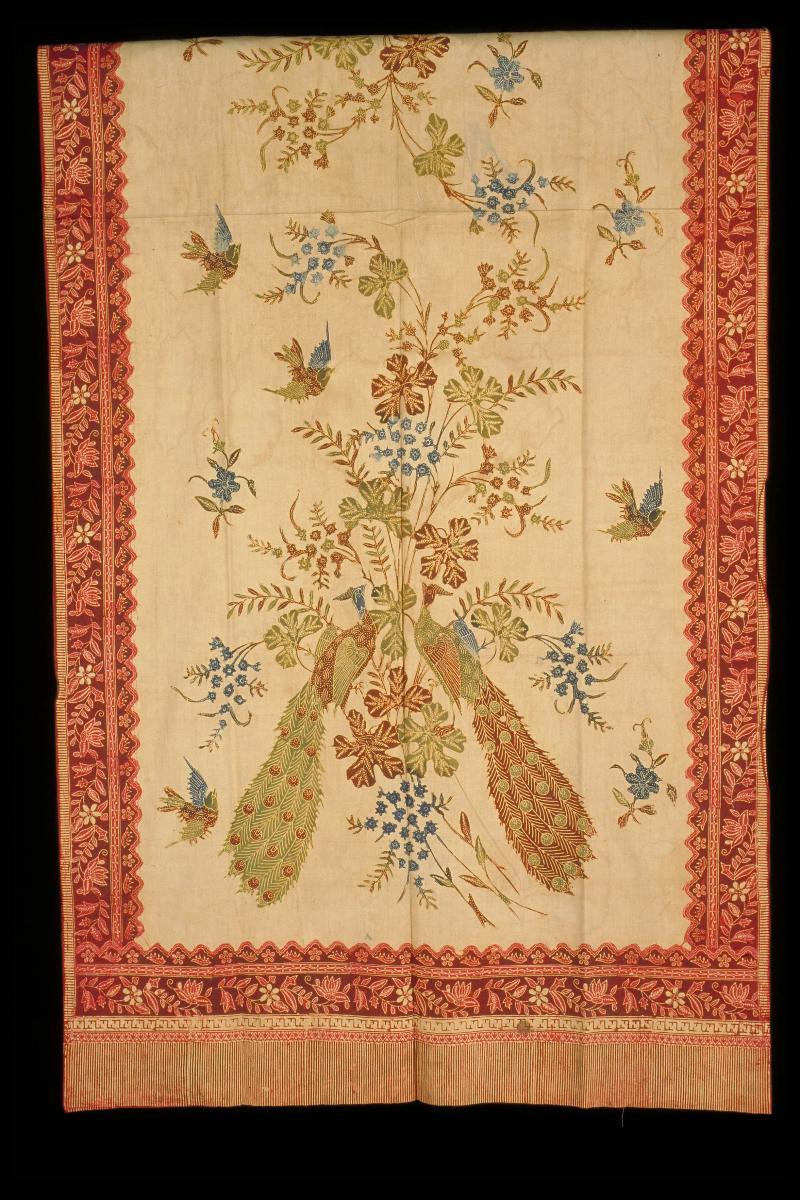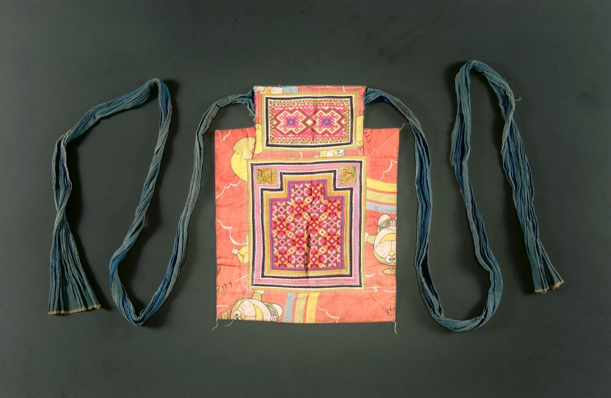 This 'T-shaped', indigo-dyed, handspun cotton baby carrier is decorated with roundels with a floral motif repeated throughout the textile. Miao geometric designs included motifs. The process of making clothes - spinning, weaving, embroidery and dyeing, have been handed down for generations, from mothers to daughters, who would learn from an early age.The Miao people form one of the largest ethnic minorities in southwest China. They are mainly distributed across Guizhou, Yunnan, Hunan and Sichuan provinces and Guangxi Zhuang Autonomous Region. A small number lives on Hainan Island in Guangdong province, and in southwest Hubei province.