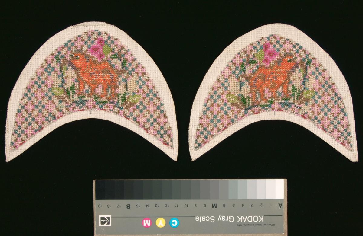 This pair of possibly unsewn women’s slippers is made with a plush velvet base of fabric. The decorative motifs are largely floral and geometrical patterns. The geometrical patterns here are created using the technique of metallic thread couching. Silver thread is laid onto the surface of the fabric, often over a needle that was later removed or over cardboard forms. The metallic threads are then over stitched with silk threads that are passed through the fabric. This technique is also known as ‘Tekad timbol’ by the Peranakans. Metal work appliqués are used to create the floral patterns at the centre of the slipper face. These are pieces of metal work sewn onto the fabric to create the desired design.