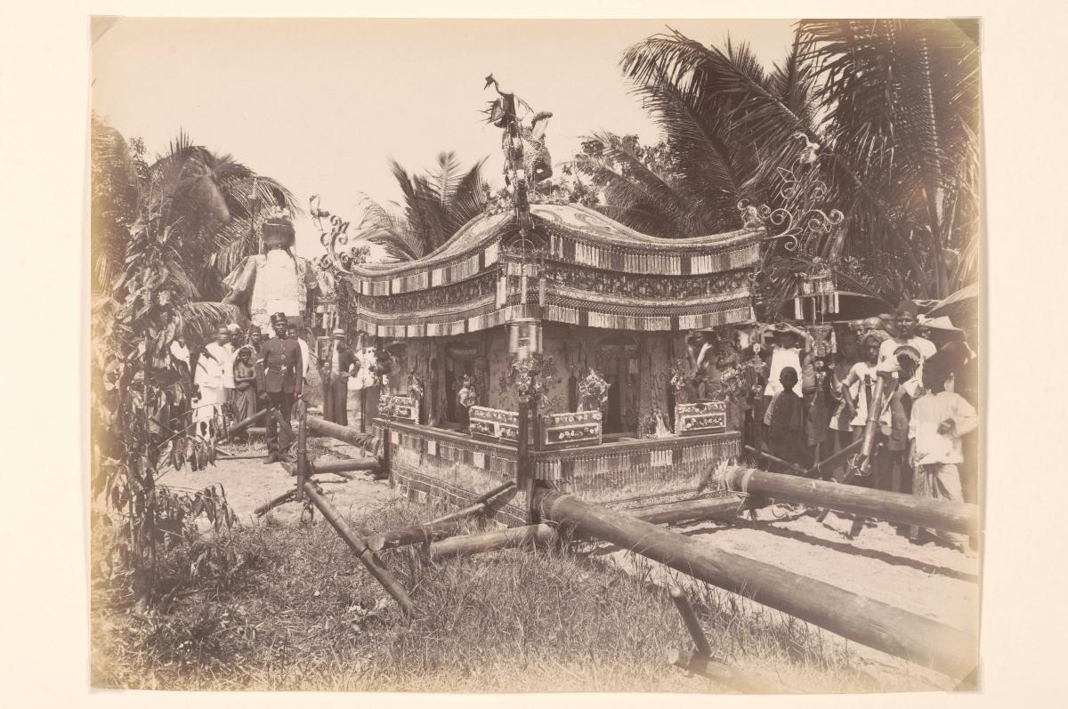 This palanquin or processional vehicle comes from Bali. It was probably used to transport deity figures called ‘arca lingga’ in various Hindu temple processions and ceremonies. These included annual cleaning ceremonies where the deity would be carried to a water source for ritual cleansing and circumambulation to drive away evil spirits. It is also believed that such vehicles were used to transport the ashes of the deceased after cremation.The fantastic architecture of the vehicle mirrors that of real temples in the Southeast Asia. The naga on the sides of the vehicle and the kala heads that flank the corners are guardian symbols designed to protect the structure. The black and white check pattern on the roof of the structure, known as a poleng pattern, symbolises the balance of positive and negative cosmic forces.