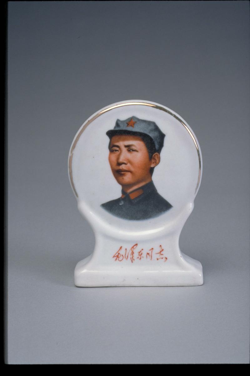 This silk portrait is a reproduction of a famous news photograph published in the People’s Daily in July 1966. The caption under the portrait describes Chairman Mao observing swimmers fighting against the currents from the deck of a speedboat. This image actually depicts Mao after his famous swim in the Yangtze River on 16 July 1966. Mao was photographed waving to crowds who had gathered by the river for a swimming competition that day. The swim taken by Mao at the onset of the Cultural Revolution has been interpreted as a demonstration of his vigour. At the age of 72, Mao showed that he could conquer the Yangtze and was also able to lead the country. Mao was an avid swimmer and advocated the activity as means to strengthen one physically.