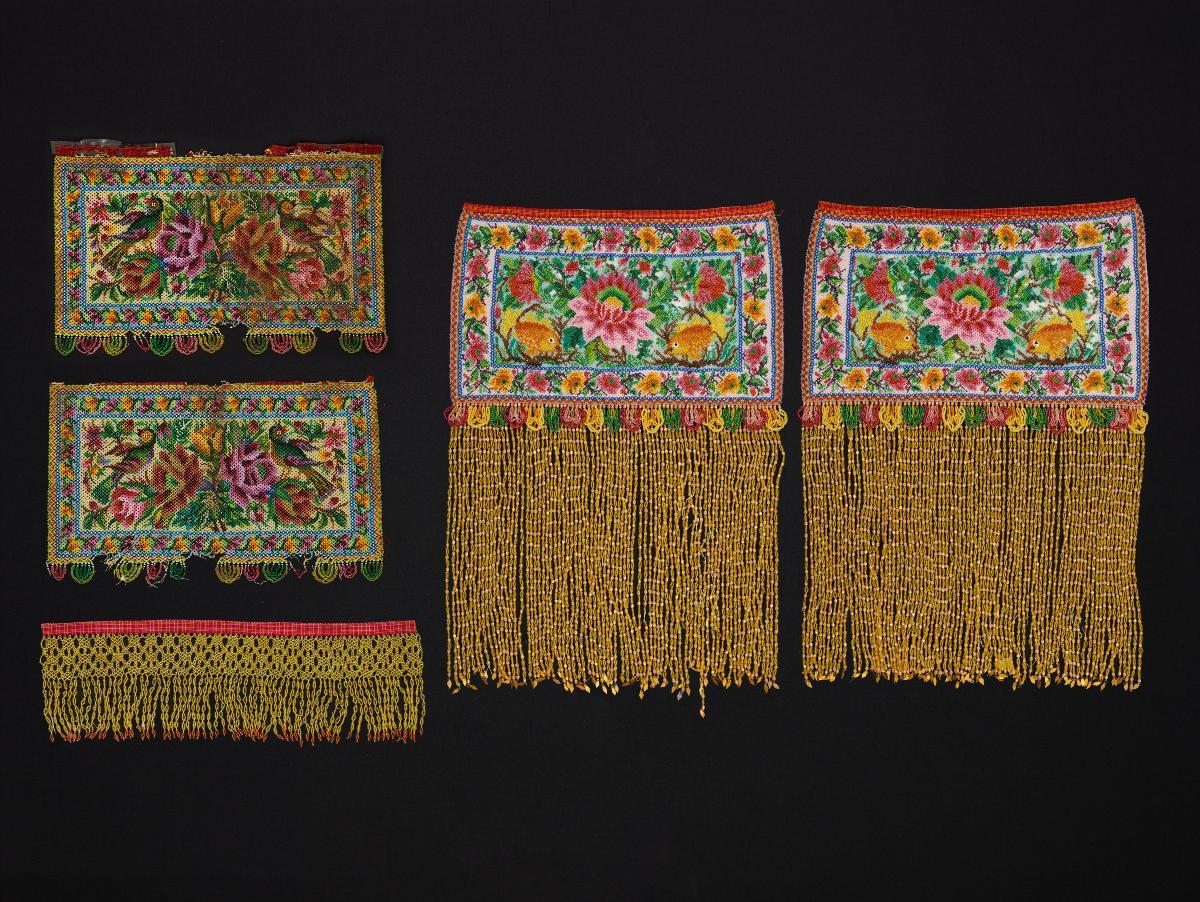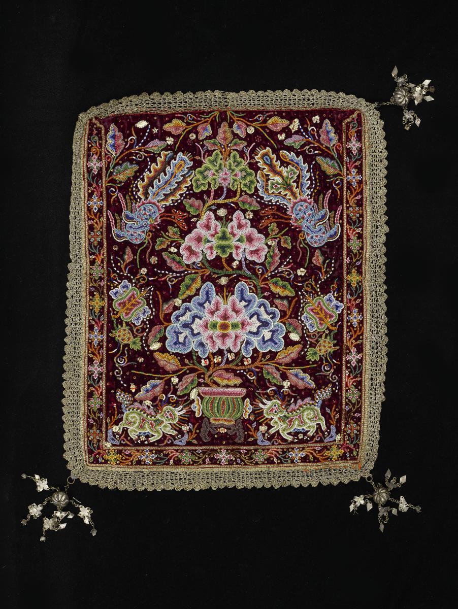 This mirror cover is created using silk thread embroidery sewn together with satin and knot stitches. Knot stitching is a technique where the thread is knotted around itself while satin stitches are a series of parallel stitches done close together. This piece has two dominant motifs, namely bright red peony blossoms and a mythical creature, possibly a phoenix. Peonies symbolised good fortune and wealth while phoenixes symbolised virtue. The practice of covering mirror surfaces is a common one in the Chinese culture. This was based on the belief that mirrors could be taken over by unwelcome evil spirits lurking nearby. The Peranakans inherited such beliefs from their Chinese ancestors and continued the practise of placing their personal mirrors in sheaths.