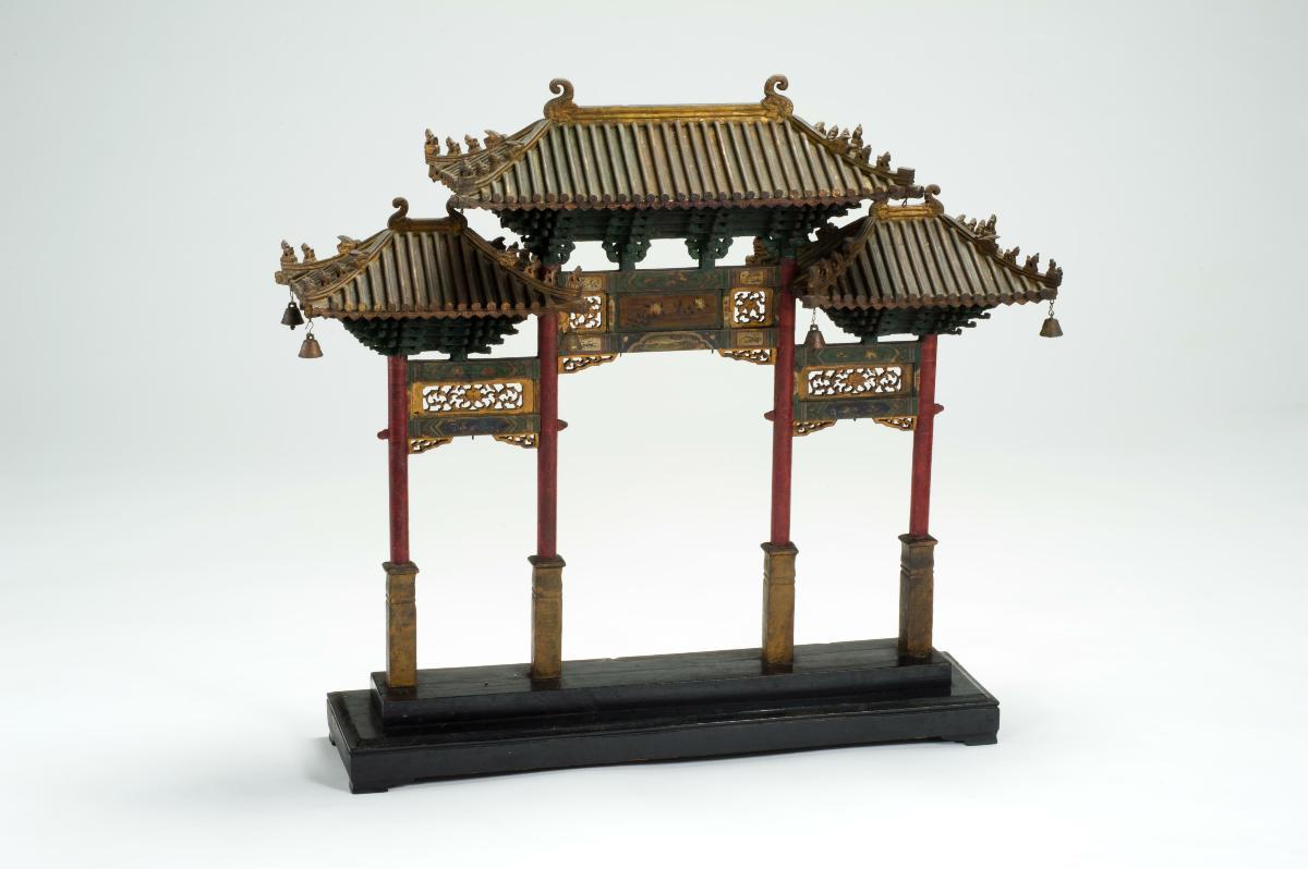 This gilded arch was erected only during a funeral and placed in front of the coffin. It features carvings of Chinese figures, mythical scenes and dragons on the upper structure. The two carved bases feature Kim Tong (Golden Boy) and Geok Lee (Jade Maiden), characters often found on Peranakan Chinese funerary items because of their association with filial piety and Ting Kong (Jade Emperor). It is believed the carvings link the celestial realm and the mortal world. Like many pieces of Peranakan furniture, the funeral arch is draped with silk embroideries when used. Attached to this gateway would be silk curtains in colours similar to that of the coffin cover. A table with candlesticks, offerings and a mounted photograph of the deceased is also placed in front of the arch.