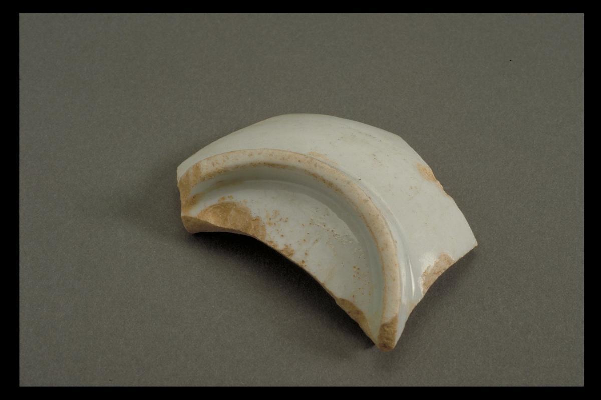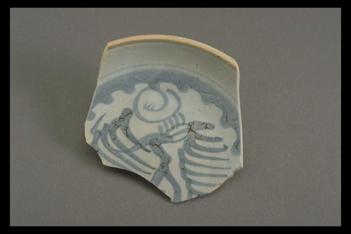 This shard was previously part of a Guan (官) or ‘official’ ware. It is undecorated and is covered in a lavender-blue, crackled glaze.Guan wares are thought to be a continuation of the northern ‘guan yao’ (‘official ware’), also known as Ru wares. The production of Ru wares ended with the Northern Song dynasty (960-1126). Guan wares were produced for the court after the capital had moved south to Hangzhou. They are located near to Longquan kilns, which supplemented supplies when demand was high.Guan ware is esteemed as one of ‘the five great wares of China’ by connoisseurs in the Southern Song, Ming and Qing dynasties.