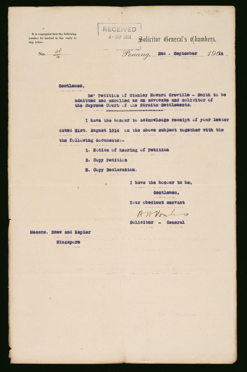 This is a letter dated 30 June 1922 sent on behalf of the Acting Attorney General of the Supreme Court of the Straits Settlements to Drew and Napier, concerning the hearing of the petition of John Cecil Rash for his admission as a solicitor and advocate to the Court. It is part of a collection of legal documents from the 19th and early 20th centuries which provides a glimpse into the work of the notable personalities who left their mark on Singapore’s legal history, and the economic and other transactions undertaken by ordinary immigrants in 19th century Singapore that tell stories of misfortune and indebtedness which would otherwise have disappeared from history.