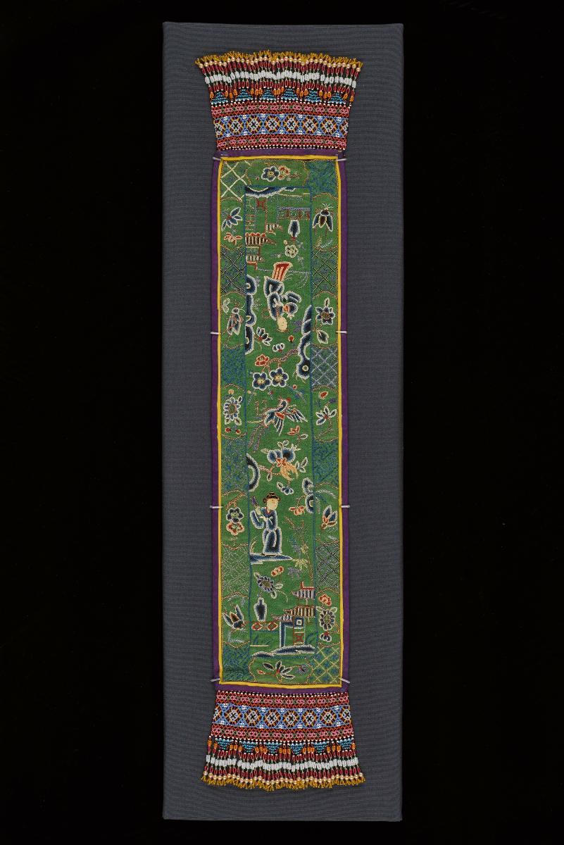 This ‘salendang’ or shoulder cloth is unusual because of its design. The light-coloured weft and wrap threads that run through the cloth are made of a special plant fibre known as ramin, which has not been used for at least a century. Cotton tassels end in multi-coloured silk ends.This textile is extremely rare and was a treasured heirloom piece. It is a type of selendang that was worn by the village chieftains of the region surrounding Tanjung Sungayang in Tanah Datar. In woven cloth, the warp is the set of lengthwise yarns attached to the loom and the weft is the yarn which is woven back and forth, across the warp, to create the woven fabric.