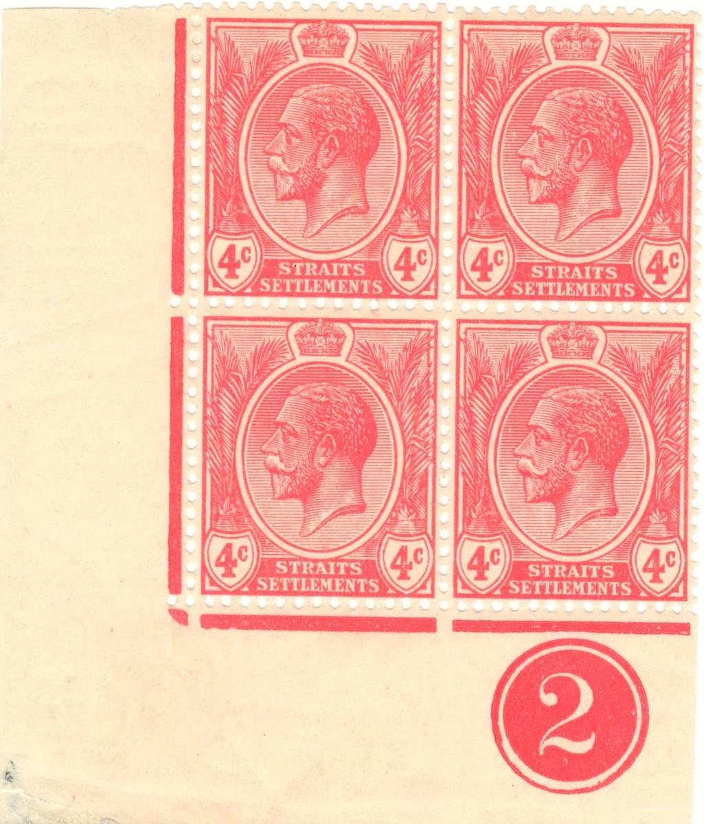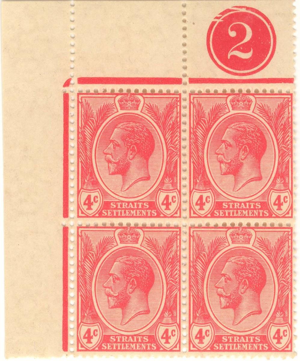 Two of the five King George V 4-cent specimen stamps - purple and carmine red.