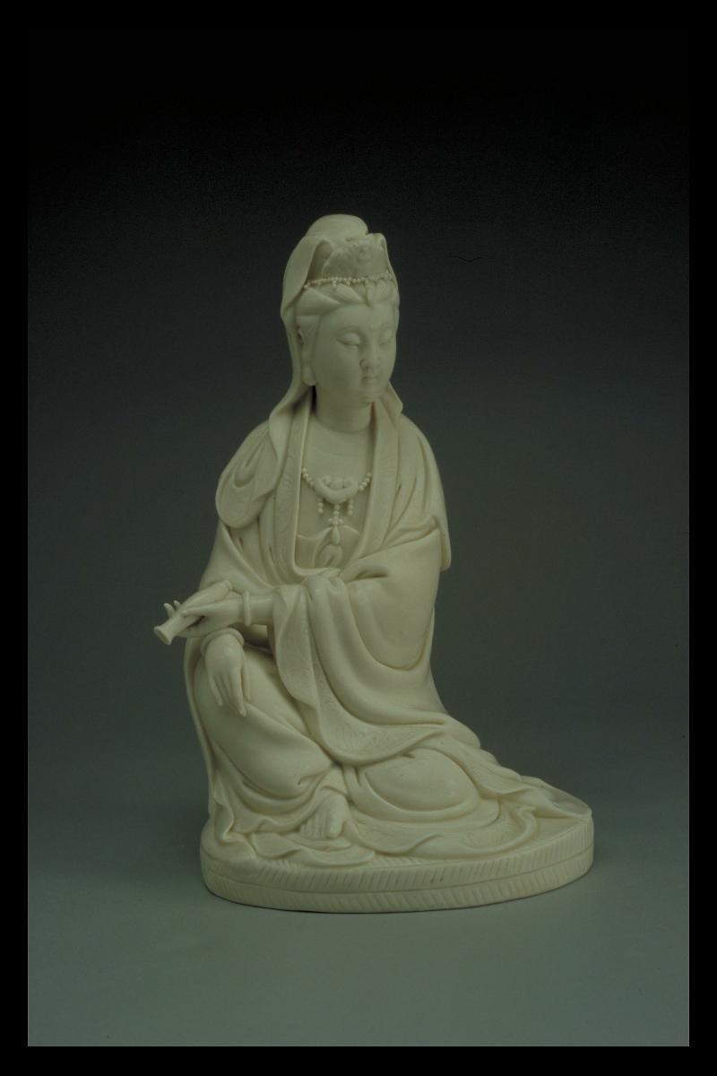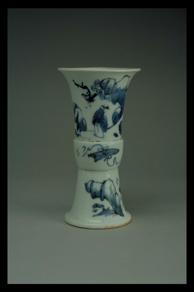 This 'gu' beaker vase appears to have been thrown in one piece, unlike other large vases, which are usually potted in sections and joined at the middle. The radial lines or 'chattermarks' round the inner walls indicate the piece was thickly potted and then trimmed with a sharp tool, to produce thinner walls. This vase was inspired by the shape of the ancient bronze gu, a type of ritual wine vessel of the Shang period (c.1700–1027 BCE). Archaic style ceramic vessels became fashionable amongst scholar-connoisseurs such as Song dynasty Emperor Huizong (1100 – 1125CE).The use of archaic wares continued during the Ming dynasty (1368-1644). The fashion for archaism was revived again during the reign of Qianlong (1736–1795) when catalogues of the Imperial art collections inspired the production of all sorts of arts and crafts in ancient styles.Dehua, located on the southeast coast of Fujian province, is well known for its production of white porcelain, known to Europeans as 'blanc de Chine'. The earliest Dehua porcelain was produced as early as the 14th century but the production and quality of these porcelain peaked around the 17th and 18th centuries.