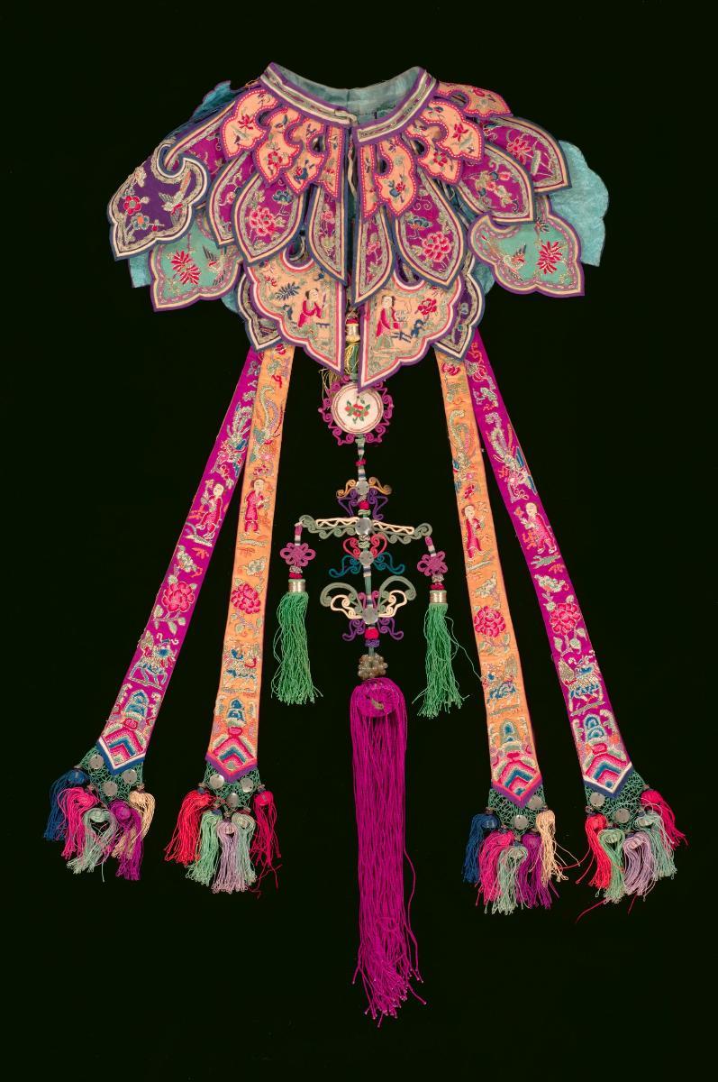This is the top half of the ceremonial wedding garment worn by the page girl. It is a T-shaped garment with straight cut sleeves that are broad and long and is modelled after the designs of Ming Period costumes. This crimson garment has sleeves with parallel rows of embroidered designs and the front of the garment features auspicious Chinese motifs such as the phoenix, peony, birds and butterflies. The phoenix symbolises high virtue while peonies are symbols of spring, which is considered a good time to get married. Butterflies are symbols of romance and love. Wedding couples in Singapore and Malacca were usually flanked by a page boy and page girl while a wedding couple from Penang would usually have a pair of page boys and page girls. Most of these garments were manufactured in China by skilled, professional embroiderers before being shipped to their Straits Chinese customers.