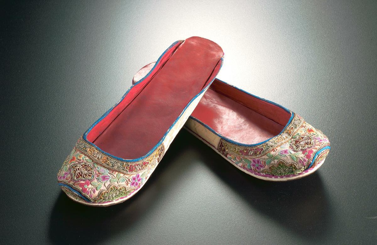 This pair of beaded slippers is embroidered using silk threads, gold threads and sequins on a velvet base. The floral motifs are created using coloured silk threads while the rest of design uses gold metallic thread couching. The motifs are raised in high relief and to create this effect, thin strips of cardboard are cut out and pasted onto the parts of the outlines intended to be highlighted. The designs are then embroidered with silk, gold or silver threads using the long and short stitch, the alternating stitch or the overlapping stitch. This pair is possibly a pair of wedding slippers worn on the other days of the wedding celebrations apart from the main celebrations. The heavy use of gold thread work served to identify this category of footwear.