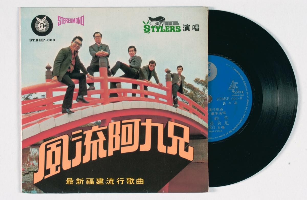 This Hokkien vinyl record titled ‘Feng Liu Lao A Bo’ (风流老阿伯) features pop songs by the band The Travellers (旅者乐队, Lǚzheyuedui). The 45 rpm record was produced by Sina Records (仙娜唱片, Xiannachangpian).