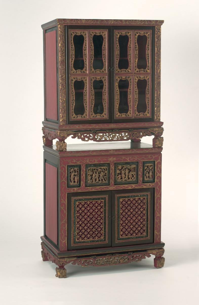 These are the doors for a pair of wall cupboards which are known as ‘piak tu’ in Baba Malay. These cupboards were usually commissioned in pairs and were built into the walls of the traditional Peranakan Chinese terrace house. They were usually found in kitchens and dining rooms, with dining room ones usually more elaborately decorated. Part of the family's collection of Nonyaware was usually stored in such cupboards. Like the fence door or ‘pintu pagar’, ‘piak tu’ were also features of the house that hinted at the wealth of the family.