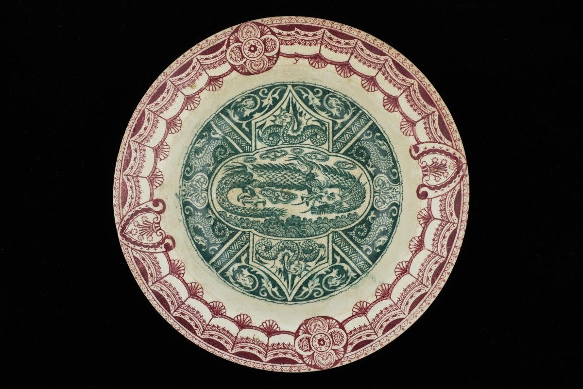 This finely painted plate with scalloped rim copies a Japanese Imari design. The original would have had panels of diaper and floral motifs around a central image of flowering prunus. Here, the design has been simplified with fewer radiating panels and scattered chrysanthemum medallions. This pattern is known as ‘Old Mosaic’ and when used on Worcester porcelain, it is usually accompanied by an imitation Chinese mark on the base. The manufacturers probably hoped to fool European buyers into thinking that they were buying imported porcelain.Japanese porelain in the Imari style had a great impact on European ceramics. Imari porcelain was produced in the area of Arita in present-day Saga prefecture on Kyushu Island and derived its name from the port where it was shipped. The range of enamels used on Imari wares is fairly wide but generally consists of blue, red and gold. The colours and patterns of Imari wares were reproduced by European porcelain factories, highlighting the popularity of Japanese designs with European customers in the 18th century.