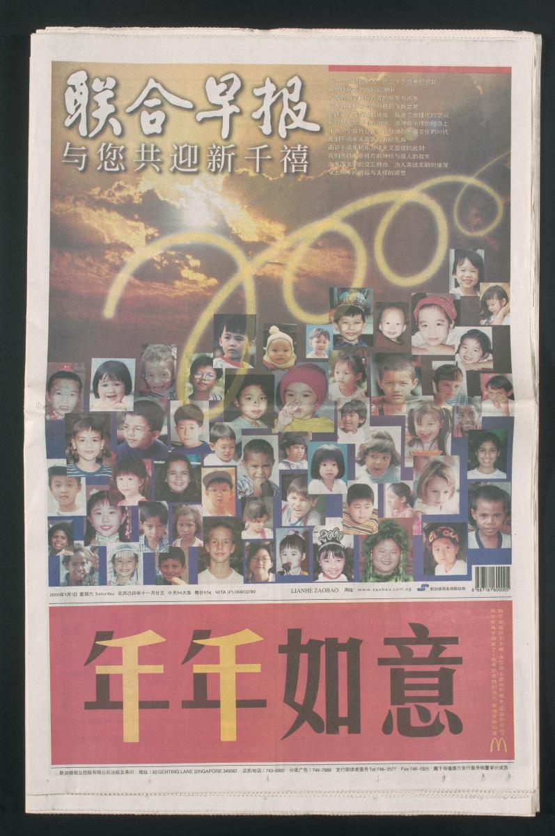Lianhe Zaobao is a daily Chinese language broadsheet newspaper owned by Singapore Press Holdings. It is the highest circulated Chinese daily in Singapore, with a daily readership of about 800,000. It was established in 1983 with the merger of two of Singapore’s oldest Chinese newspapers, Nanyang Siang Pau and Sin Chew Jit Poh. This particular edition of Lianhe Zaobao is significant as it is the last edition of the 20th century.
