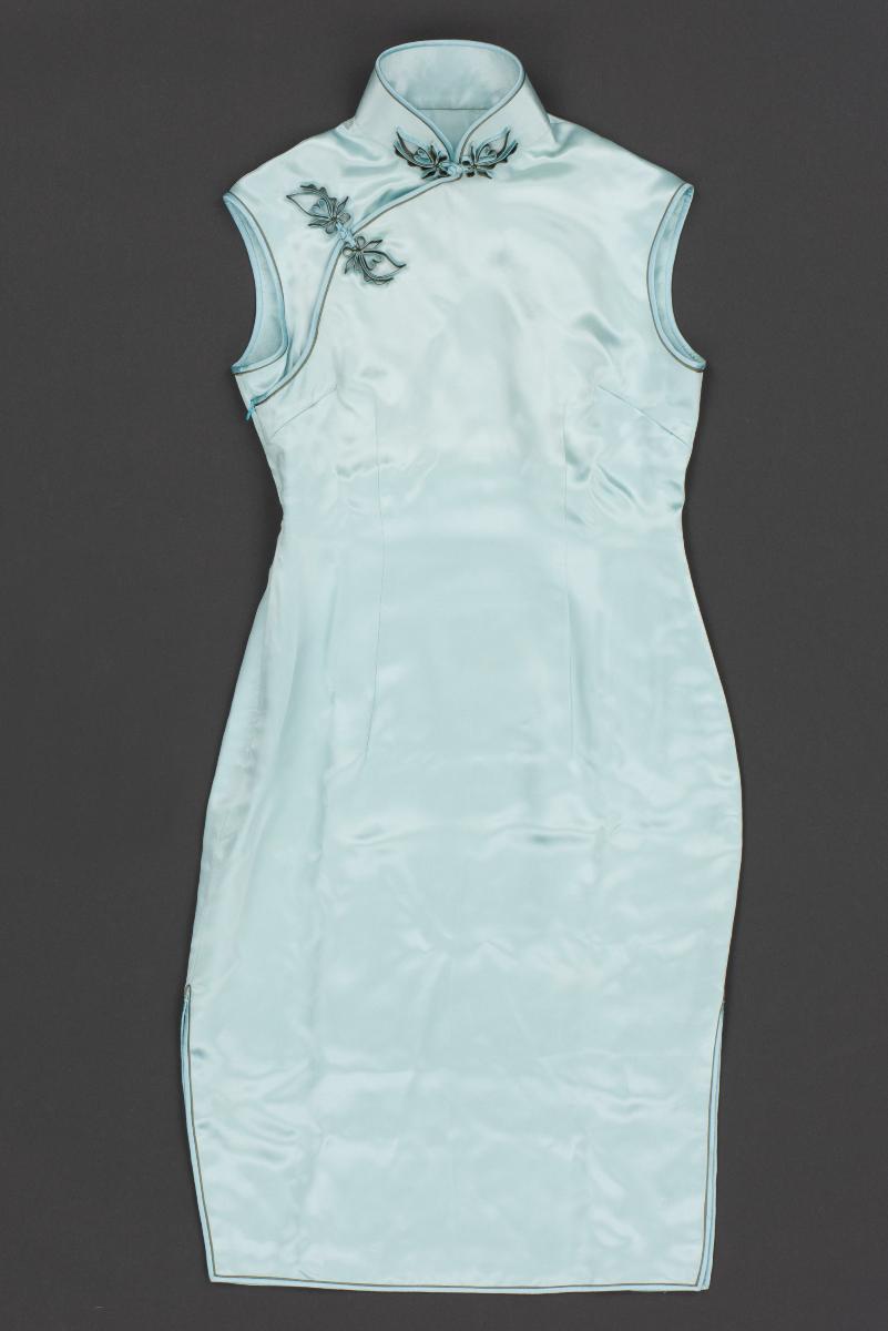 This midnight blue cheongsam with cap sleeves has a nipped in waist which is typical of the 1950s Western silhouette. Such a trend was not only seen in cheongsam, but also in other ethnic costumes such as sari and sarong kebaya.In the 1950s and early 1960s, socialites and film stars such as Lin Dai were often spotted in the latest designs of cheongsam. The cheongsam was at its most stylish and was most commonly worn at functions in Singapore during that time.