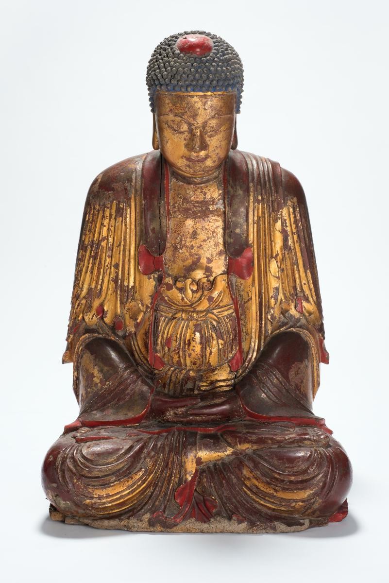 This figure of Buddha sits serenely with right hand resting on the left, or dhyana mudra (gesture of meditation). The posture represents the attainment of Enlightenment, and this is reinforced by the flame finial emerging from his head. This dramatic feature and the finely delineated facial features such as the arched eyebrows and elongated earlobes hark back to attributes found in classic Sukhothai art, which were established some four hundred years earlier. Buddha images in the Rattanakosin style are highly decorative, with emphasis given to the tactile qualities, such as the texture of the robes. On this Buddha, a fine relief pattern made with lacquer decorates the robes, which shimmer from pieces of mirror glass and gold leaf. The downward gaze is intensified by the luminous mother-of-pearl inlaid to make the whites of the eyes.