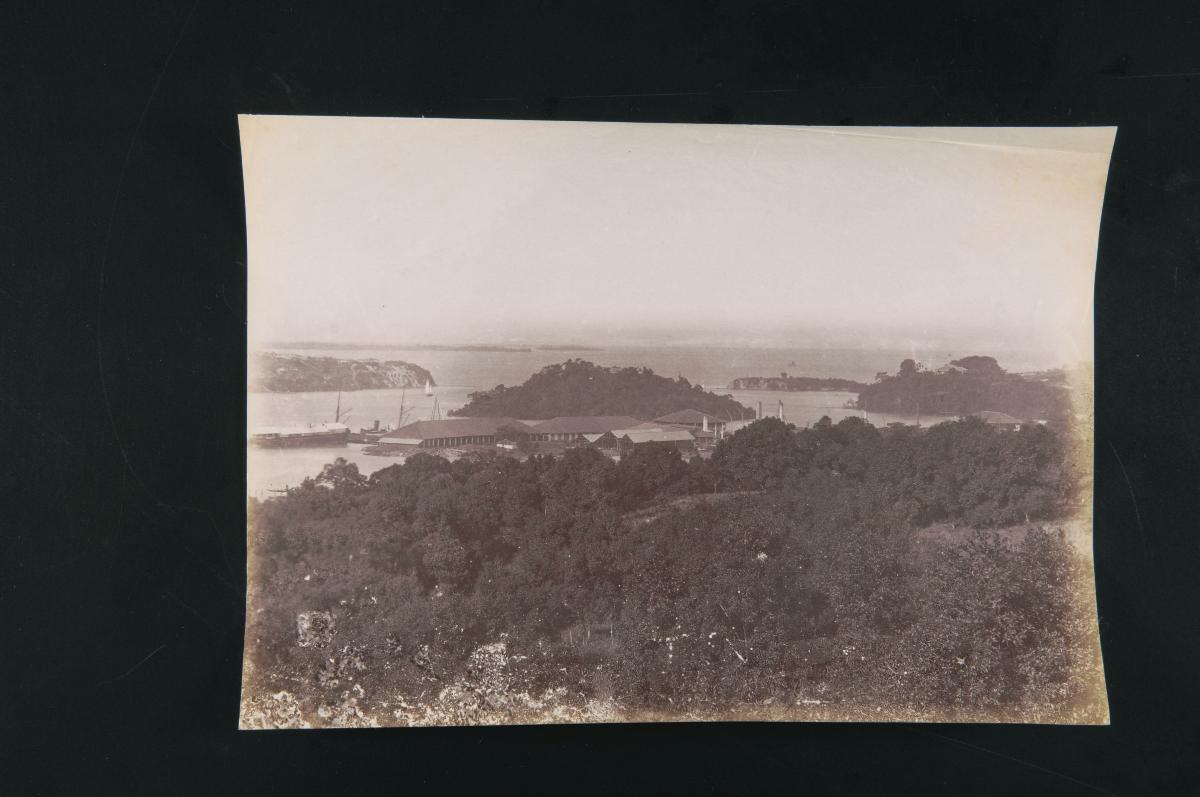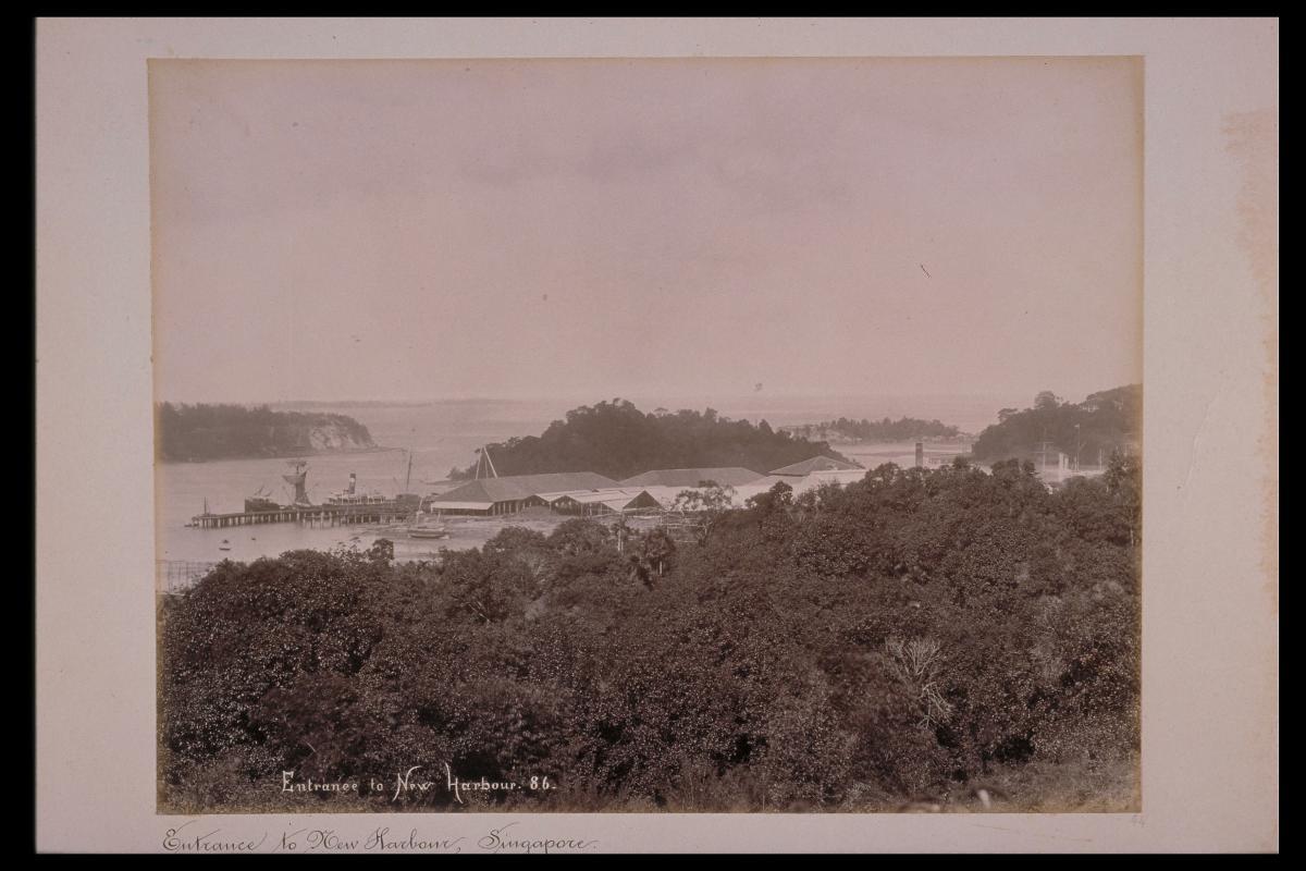 Lambert's panoramic view of New Harbour offers a unique topographical view of the southern coast of the island from the perspective of one of the southern islands, probably Blakang Mati (Sentosa) today.