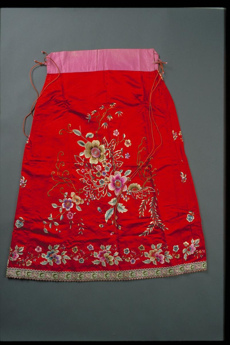 This bridal skirt is made up of two pieces, a frontal panel and a back panel joined together at the waist by strings. It is made possibly from pink silk with the decorative motifs done using silk threads and gold thread couching. It features the peony flowers, phoenix, butterflies and the qilin. Peonies symbolise spring, love, beauty and good fortune while the phoenix can represent beauty, grace, high virtue, the Empress and the bride. The qilin symbolises fertility and good fortune whilst the butterfly is a symbol for joy, beauty, romance and dreams.These embroidered garments were usually done in China by skilled, professional embroiderers and then exported to their Straits Chinese customers.