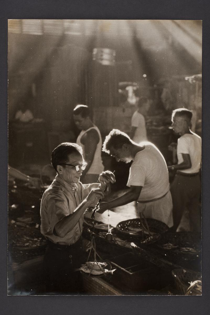 This photograph is part of a set acquired from the National Geographic Society, a non-profit scientific and educational institution. The photographs depict the sights and scenes of Singapore, Malaysia, Thailand, and Indonesia. This particular photograph shows fish vendors in a village market in Celebes, Indonesia.
