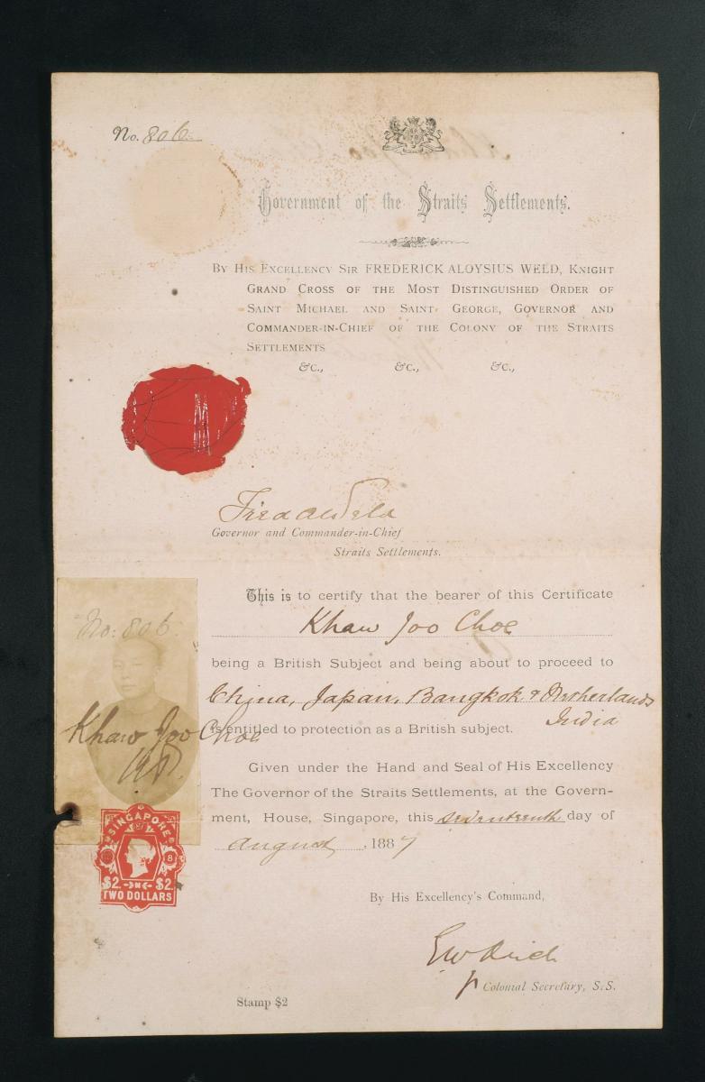 This document was issued by the Consul General for the Republic of China in Singapore to a Mr Lian Ku Cham. The bilingual document which was valid for six months allows Mr Lian to travel to Batavia (present day Jakarta, Indonesia) for business. More information about Mr Lian is provided on the Chinese side of the document. His Chinese name is 梁玖谦 and he was originally from Heungshan district (also known as Zhongshan) in Guangdong, China.