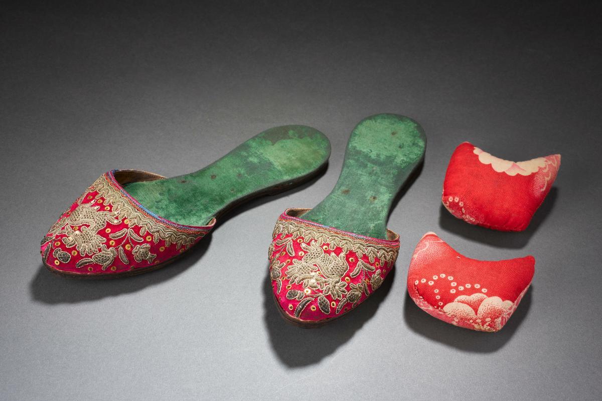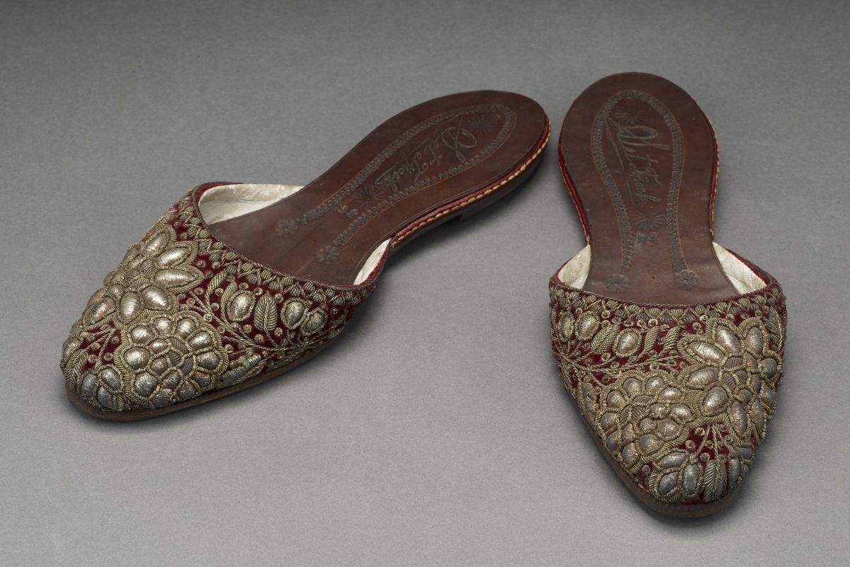 This pair of embroidered slippers bears the shopmarks which came in a variety of languages including Chinese characters and Bahasa Indonesia. Some also indicate the locality of the shop such as Batavia and Singapore.