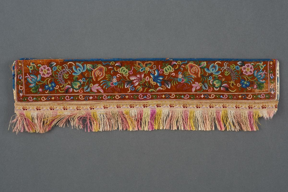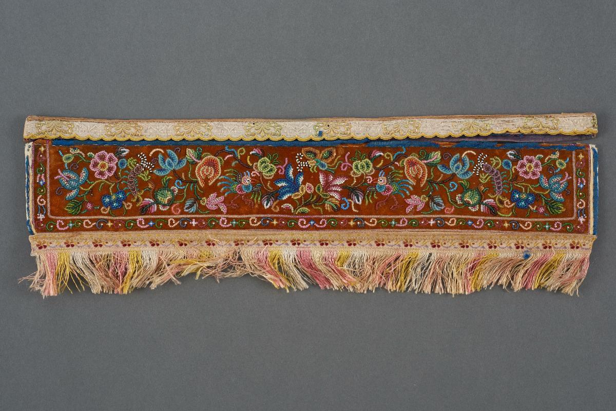 The gold wrapped thread and beaded panel is decorated with animals and flowers. At the centre of the panel is an ogival medallion containing a pair of pink and blue fish, symbolizing wealth and abundance in Chinese art. A pair of phoenixes and a large rooster also decorates the panel, as well as large peonies. Beaded panels like this would have been likely commissioned as part of the Peranakan wedding.