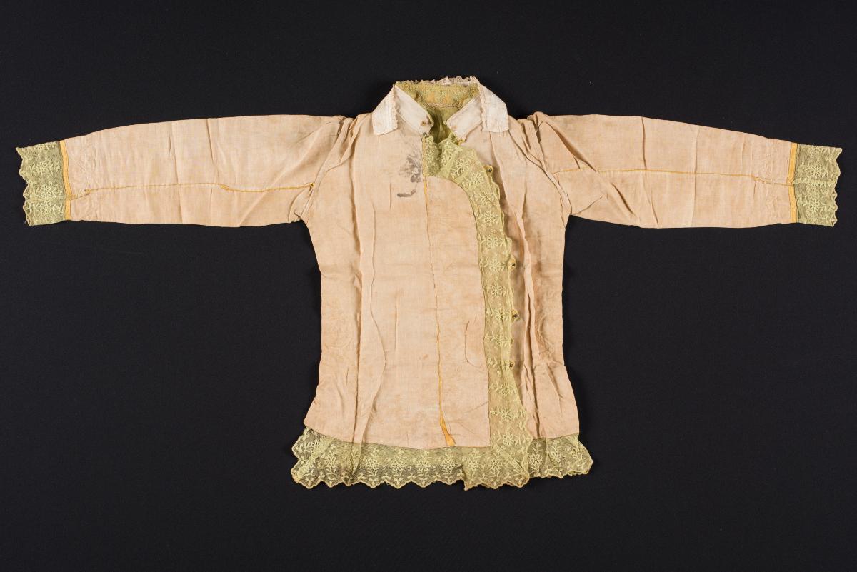 Known as a baju peiki or baju shanghai, this long-sleeved jacket with a mandarin collar lined with lace and frog buttons is made from a richly patterned green silk fabric and thickly lined on the inside. Its hem and cuffs are formed by a single row of pleats. The matching skirt or koon is made using the same material and techniques. The cotton baju peiki could have been paired with batik sarong in less formal occasions. It is part of a donation which contains a mixture of garments worn by Peranakan men and women.